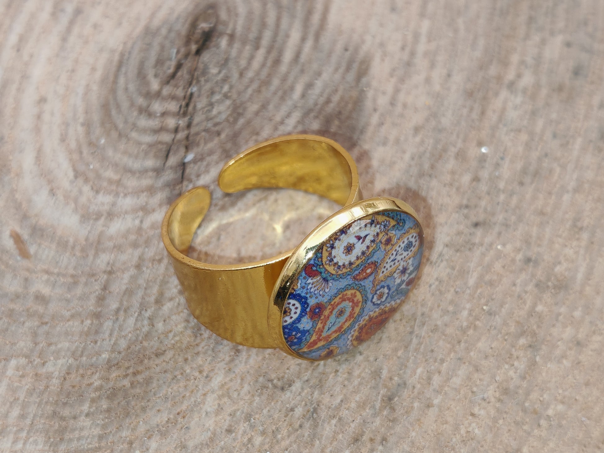 Un cabochon rond de 16 mm de diamètre révèle un motif d’arabesques fines, mêlant bleu, écru, ocre et touches dorées, pour un rendu à la fois chaleureux et raffiné. Le motif est protégé sous résine, apportant profondeur et brillance.