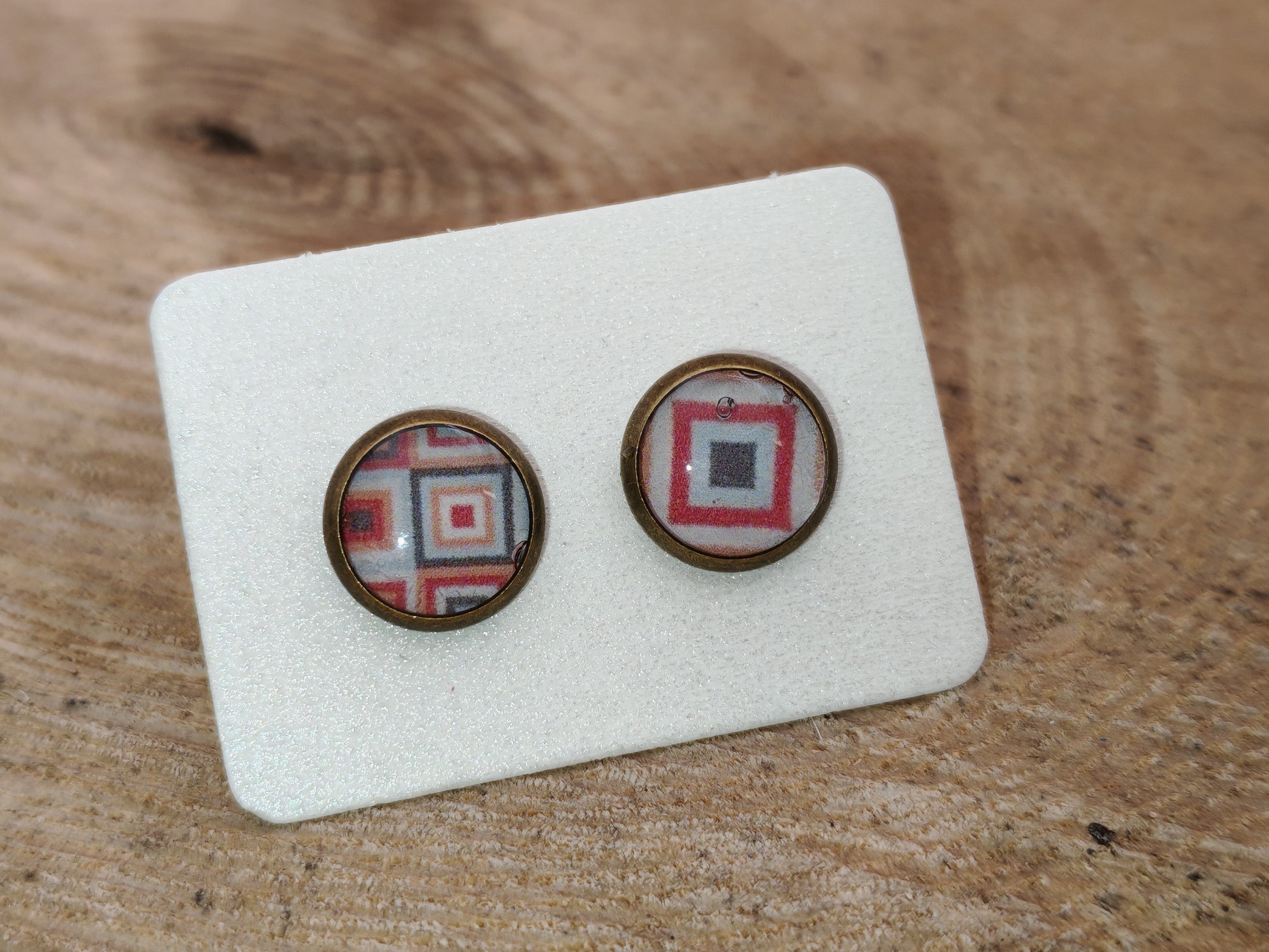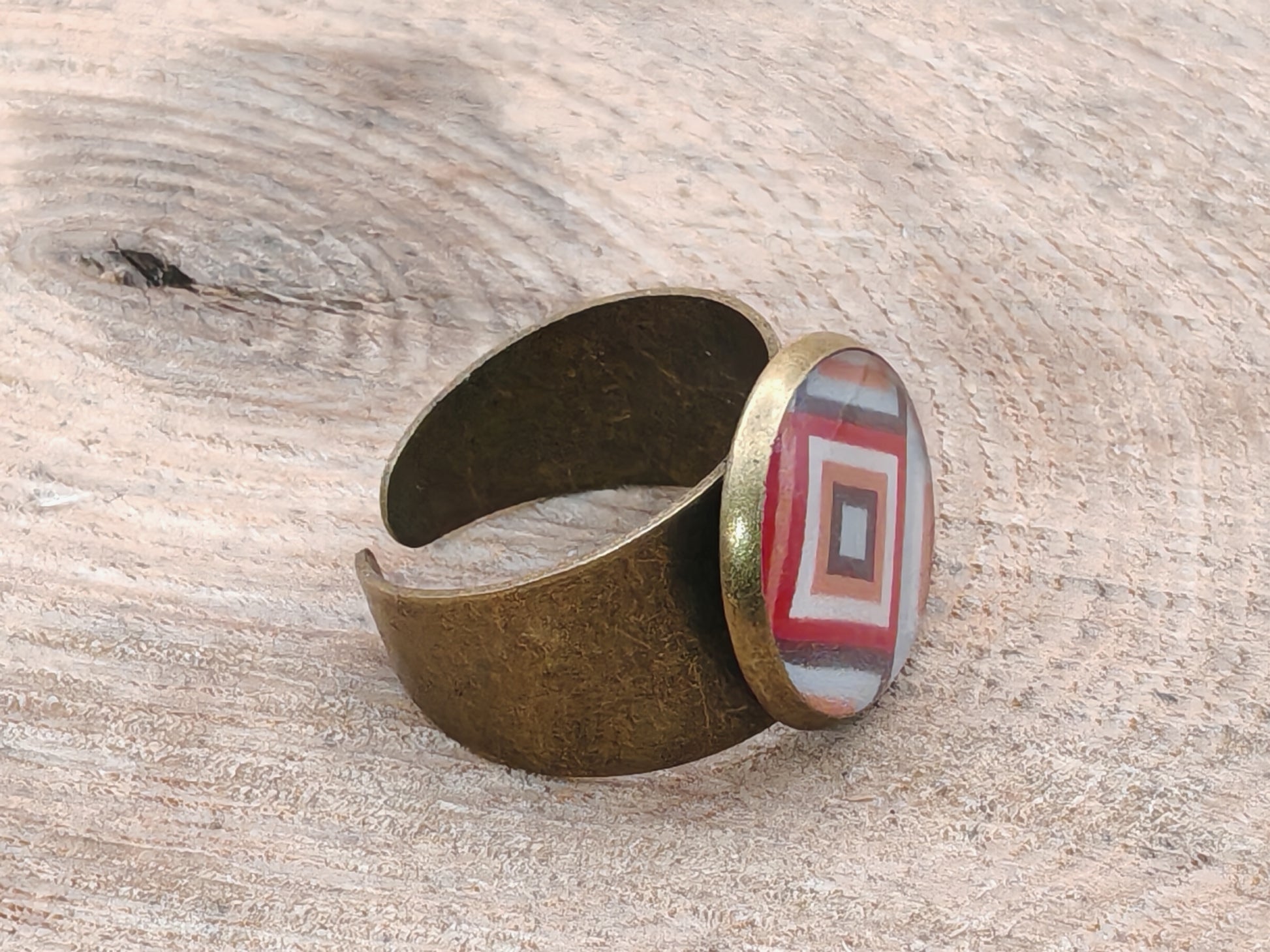 Cette bague ajustable en laiton doré ancien met en valeur un cabochon de 14 mm orné d’un motif géométrique hypnotique. Des losanges emboîtés aux nuances chaudes de corail, terracotta, crème et noir dessinent un kaléidoscope doux et envoûtant.