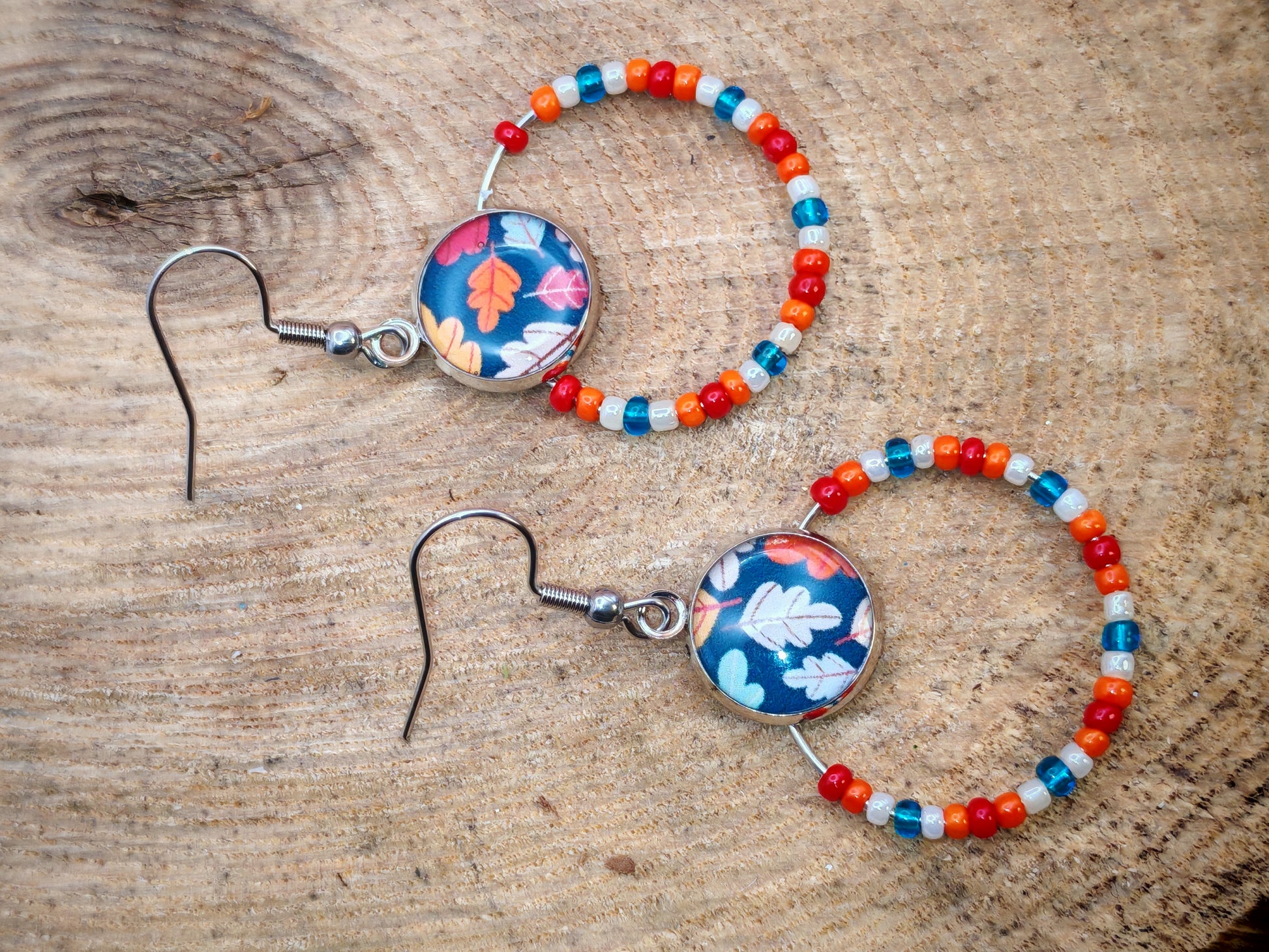 Ces créoles argentées aux attaches en acier inoxydable célèbrent la chaleur des couleurs automnales. Les cabochons ronds, aux motifs de feuilles dans des tons orange, rouge, blanc et bleu sur fond marine, évoquent une balade en forêt à la saison des récoltes. Les perles de verre rouges, orangées, blanches et bleues reprennent cette palette vive et contrastée, pour un rendu éclatant et joyeux.
