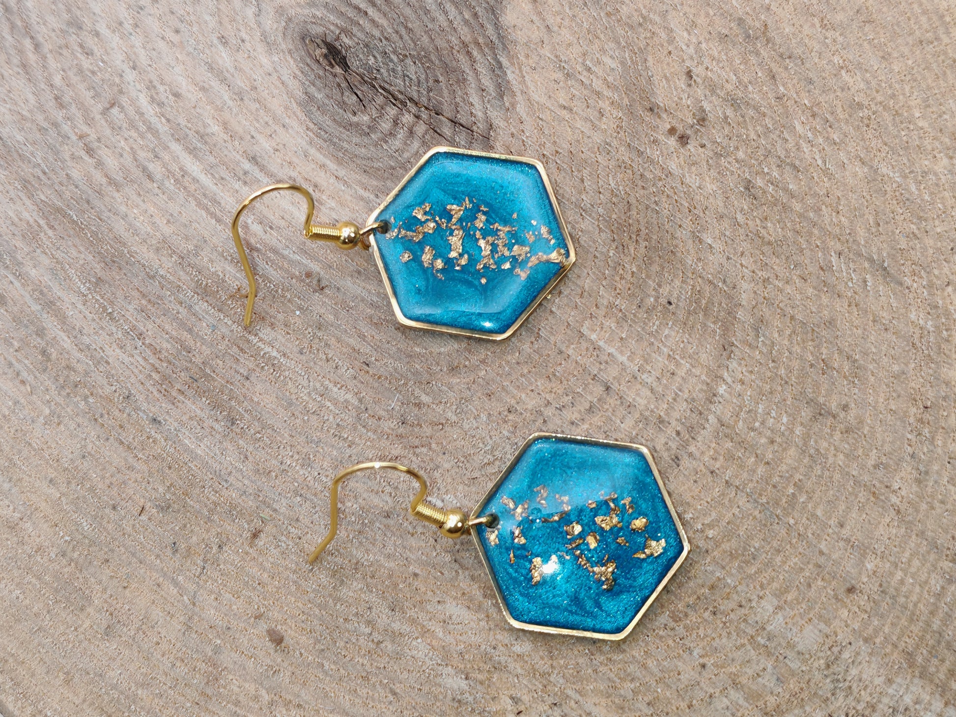 Ces boucles d’oreilles hexagonales de 22 mm de diamètre dévoilent un bleu lagon profond, habillé de fragments d’or qui scintillent comme des reflets de soleil à la surface de l’eau.