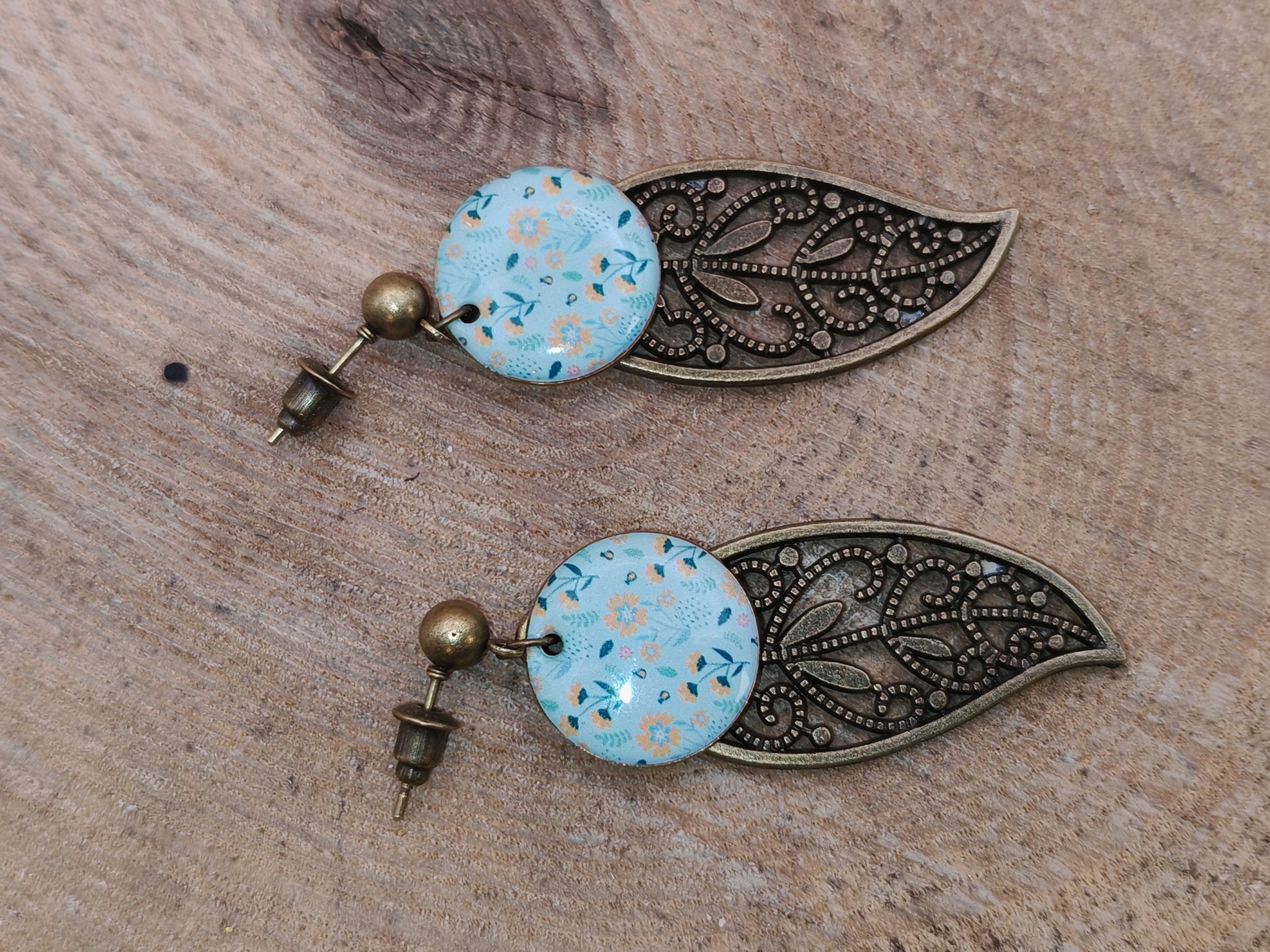 Ces boucles d’oreilles associent un disque de 16 mm au décor floral délicat sur fond bleu clair à une feuille ajourée en métal bronze au style bohème.