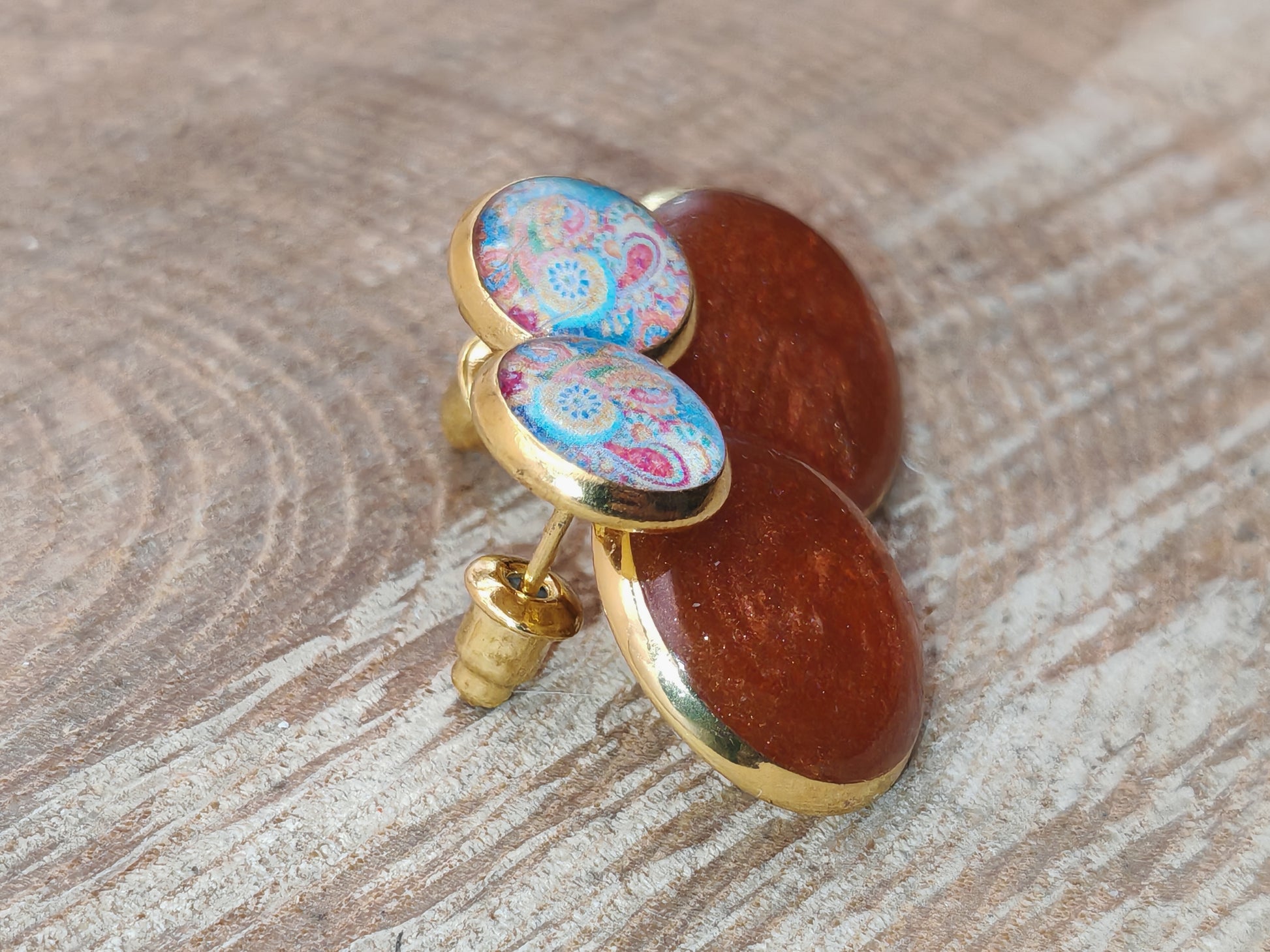 Ces boucles associent deux cabochons de 8 mm et 14 mm, unis par la résine dans une douce harmonie entre l’éclat cuivré et les arabesques colorées d’un décor cachemire.
