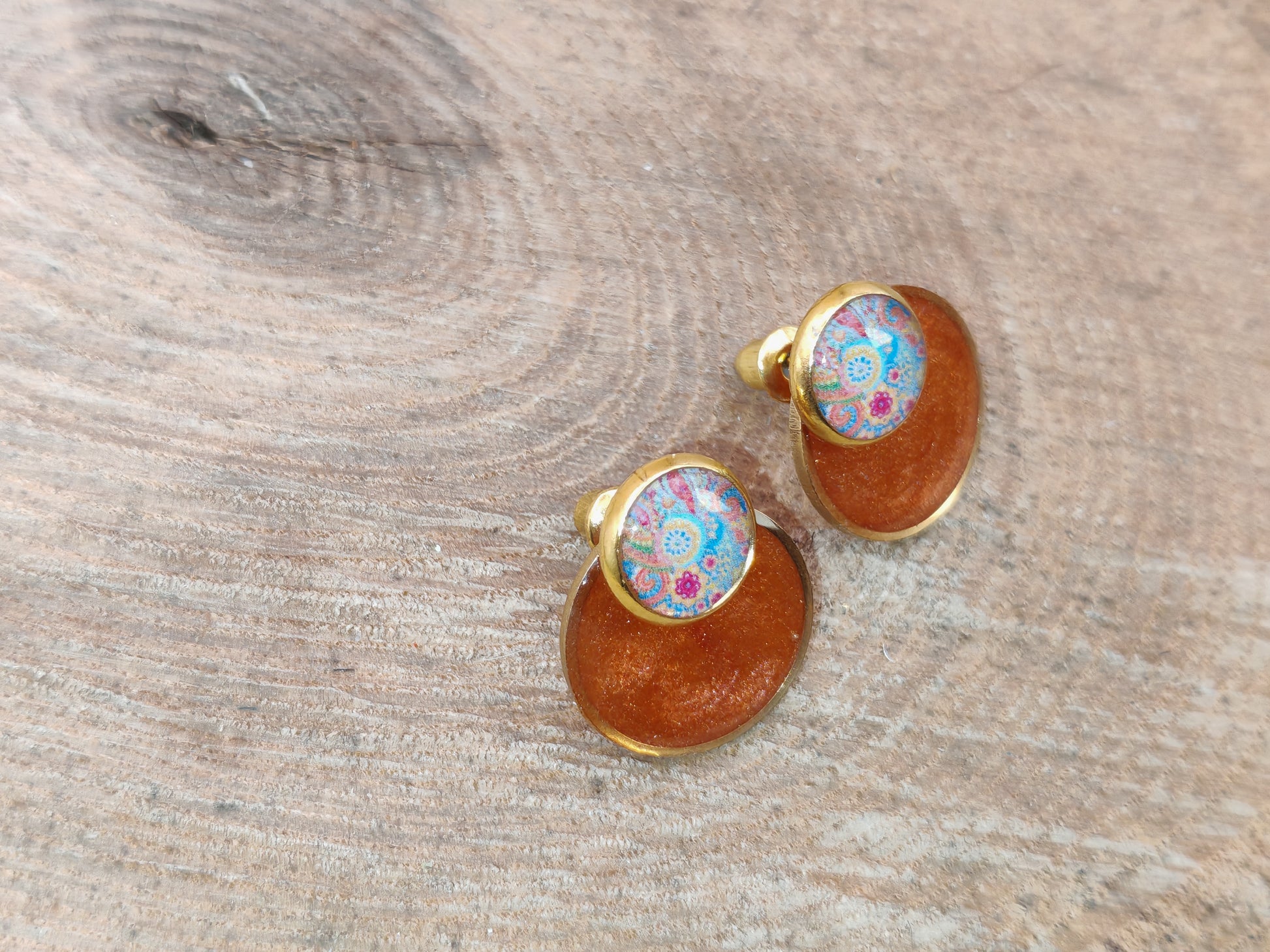 Leur cabochon de 8 mm aux motifs cachemire se marie à un cercle doré de 16 mm, empli de résine orange chatoyante.