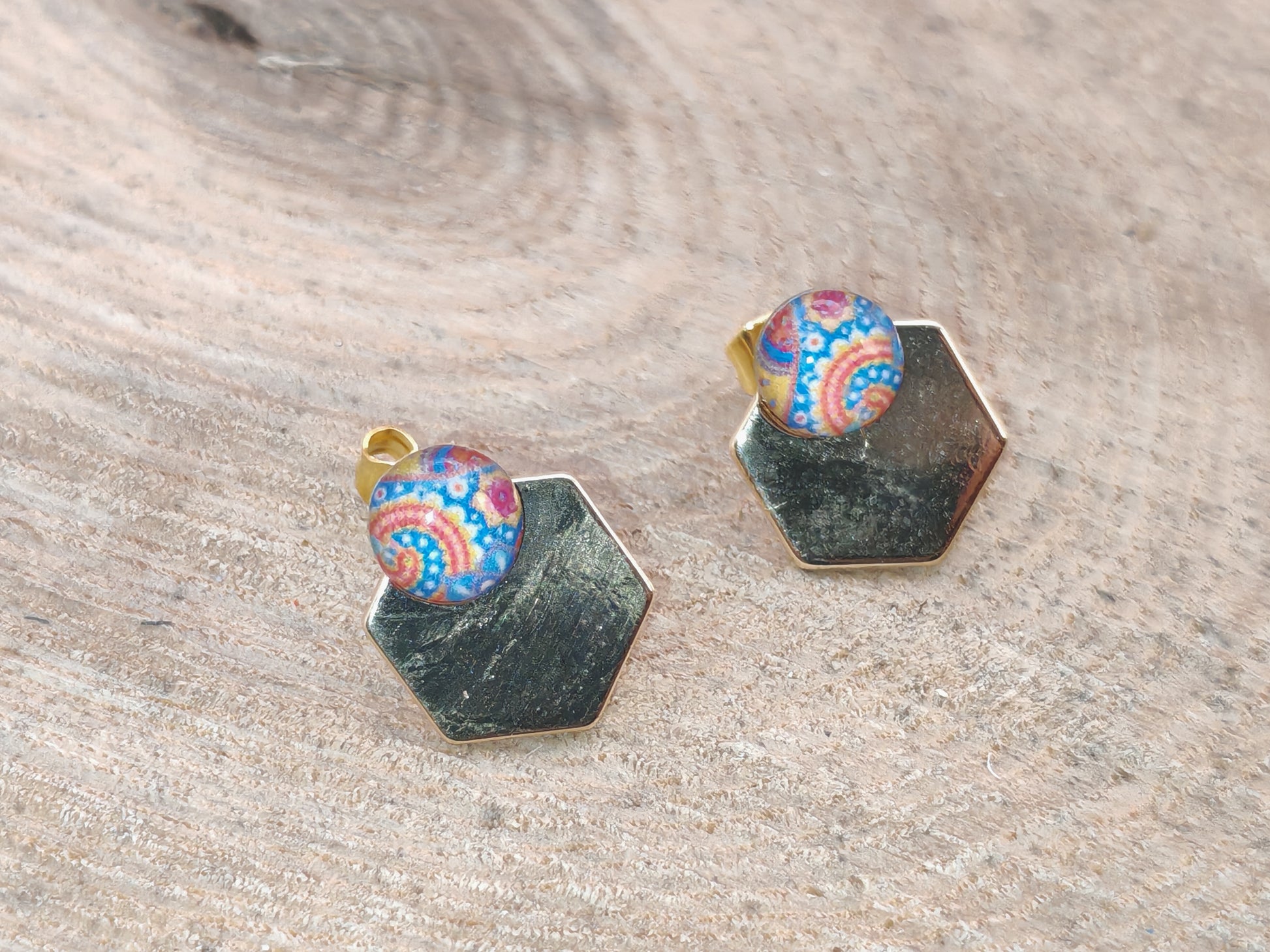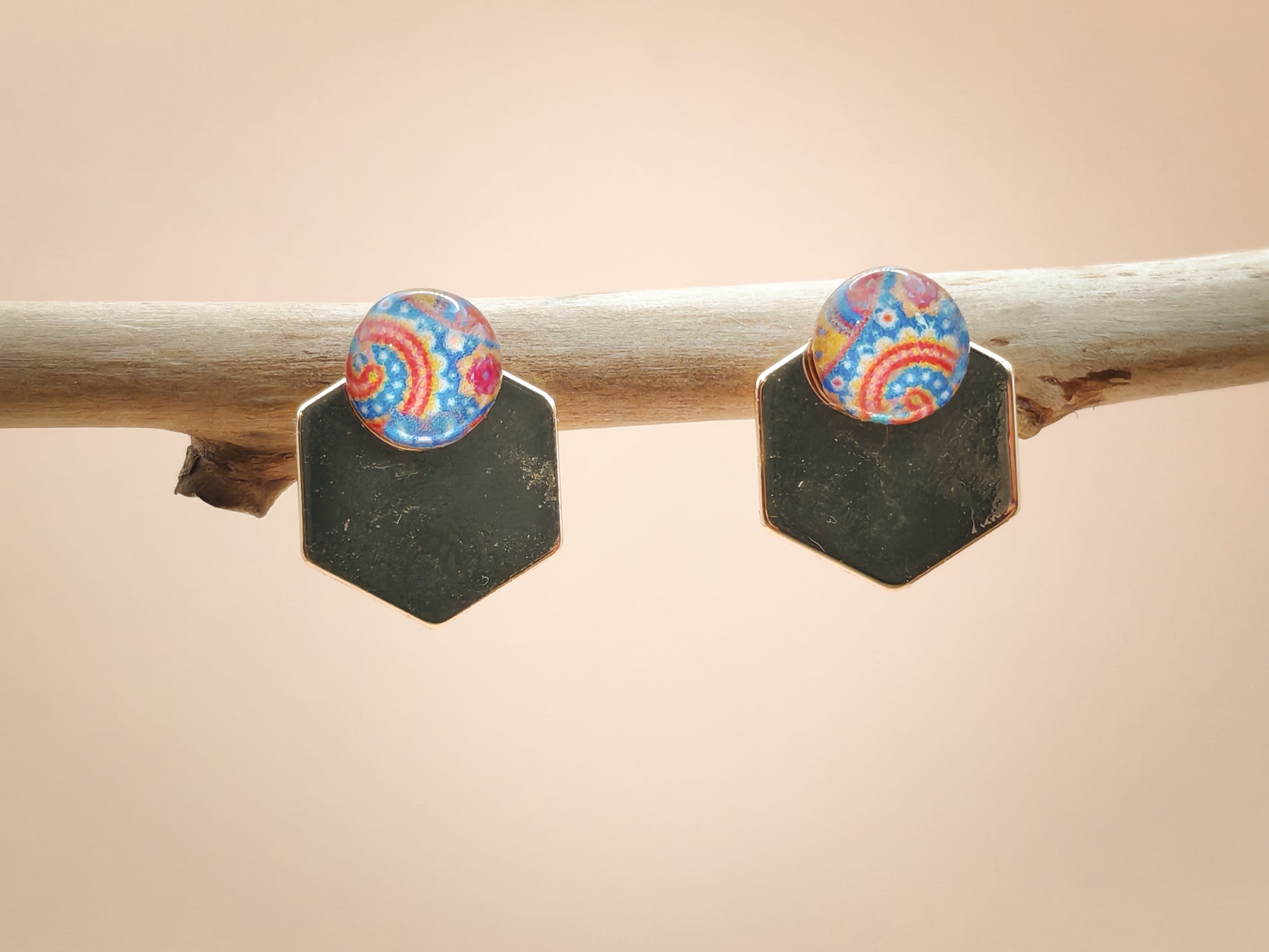 Ces boucles d’oreilles associent la finesse d’un petit cabochon coloré (6 mm) orné d’un motif cachemire lumineux, à la modernité d’un hexagone doré de 12 mm.