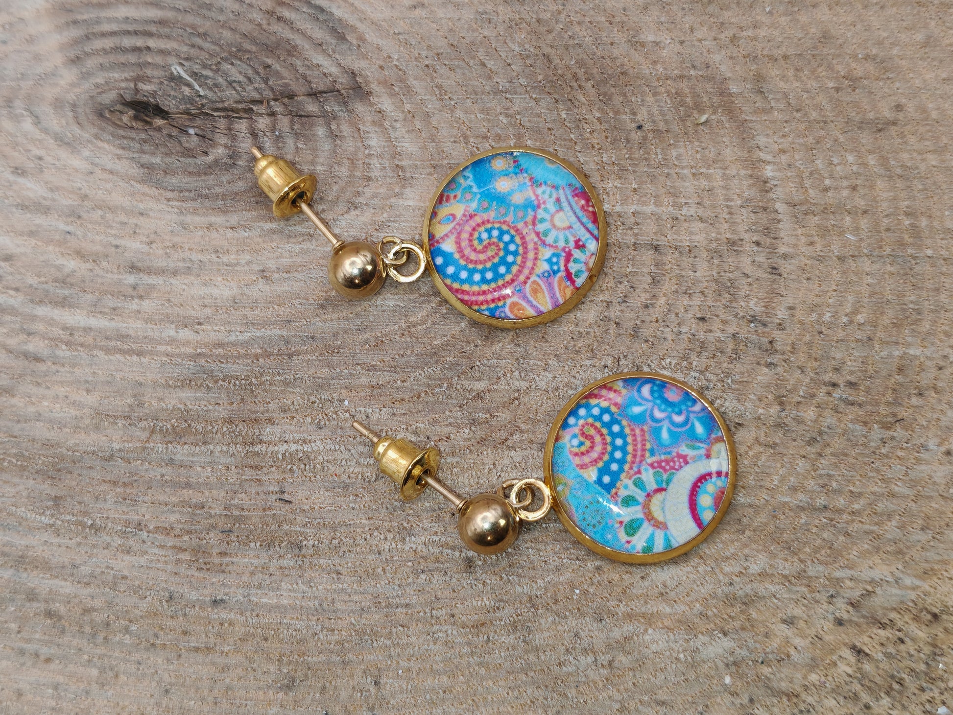 Chaque cabochon rond de 14 mm, orné d’un motif oriental vibrant, capte la lumière avec élégance.