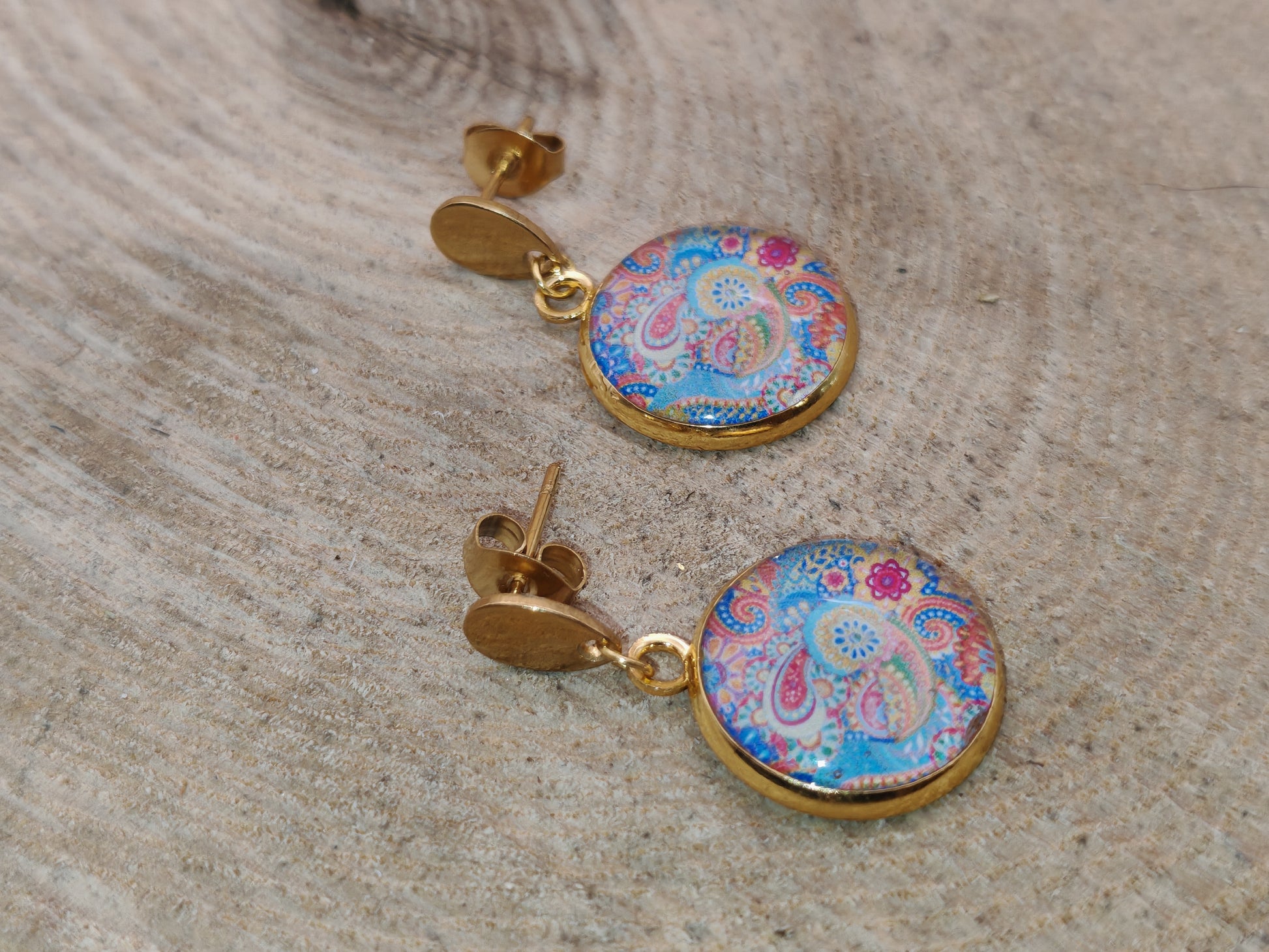 Ces boucles d’oreilles pendantes dévoilent de délicats cabochons de 14 mm aux motifs orientaux lumineux.