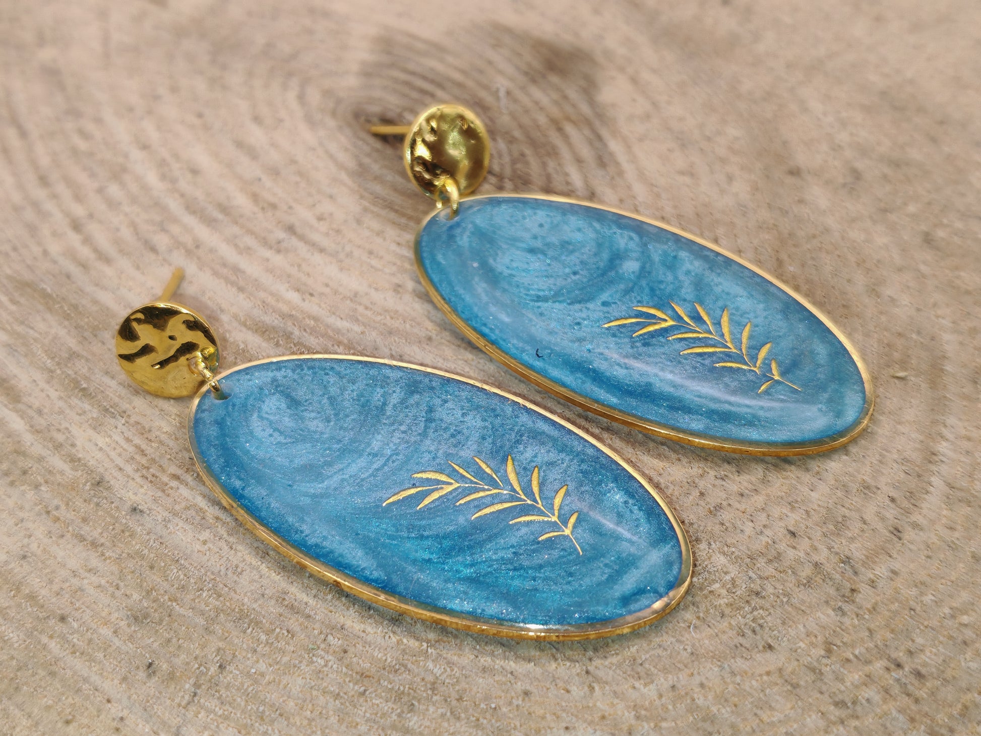 Leur ovale en résine bleu nacré, orné d’un fin rameau doré, évoque la fraîcheur des lagons et la douceur des vagues.