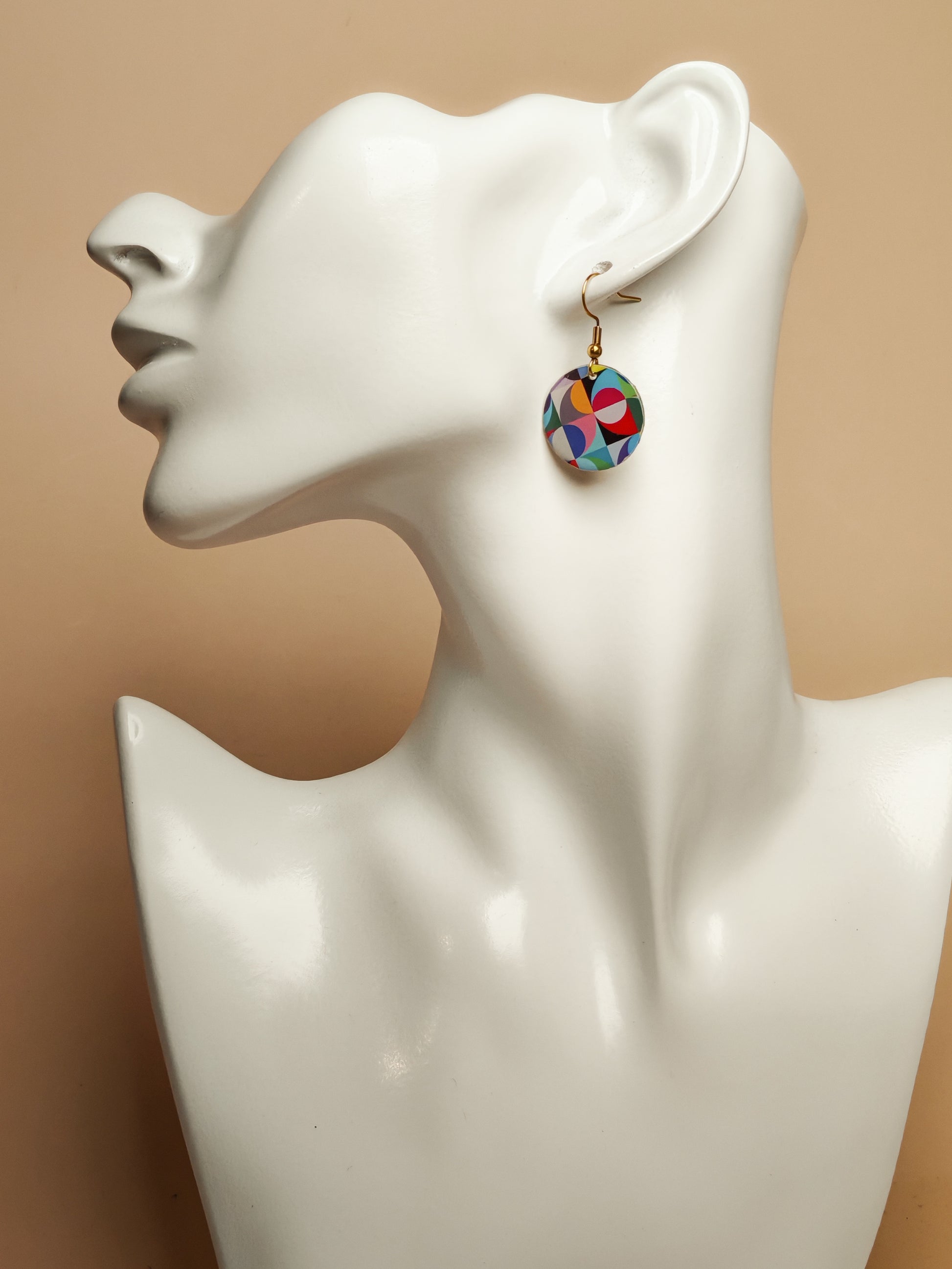 Ces boucles d’oreilles rondes dévoilent un motif géométrique aux formes douces et aux couleurs harmonieuses, mêlant tons chauds et nuances plus fraîches.