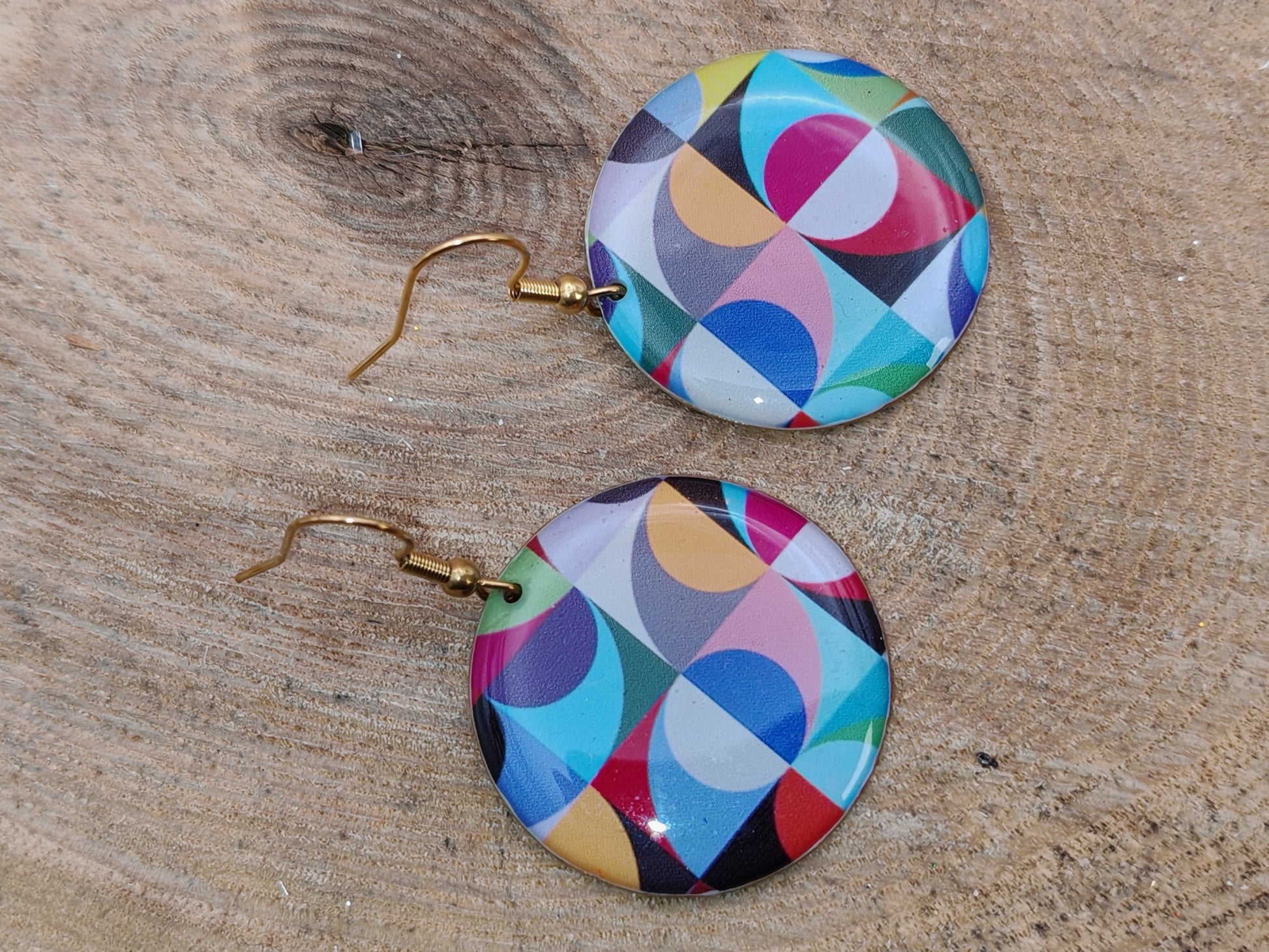 Ces boucles d’oreilles révèlent un motif géométrique vibrant, composé de formes courbes et de cercles imbriqués. Les couleurs se répondent avec harmonie — bleus profonds, verts doux, touches de rose, de jaune et de rouge — créant une composition à la fois dynamique et équilibrée.