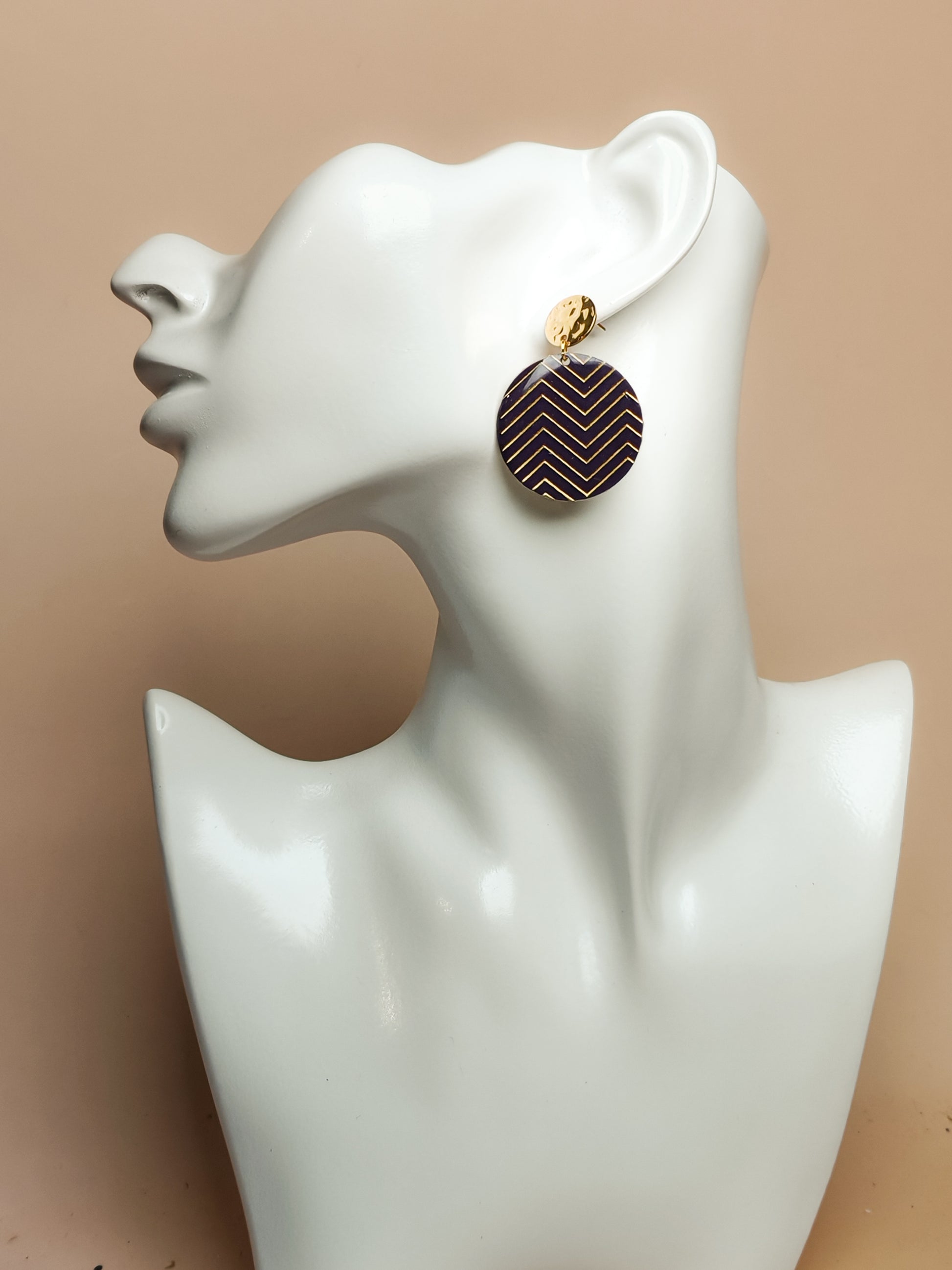 Ces boucles d’oreilles jouent sur un équilibre élégant entre rigueur graphique et reflets lumineux. Le motif géométrique violet est rythmé de lignes dorées, dessinant un jeu de chevrons qui capte la lumière avec subtilité.