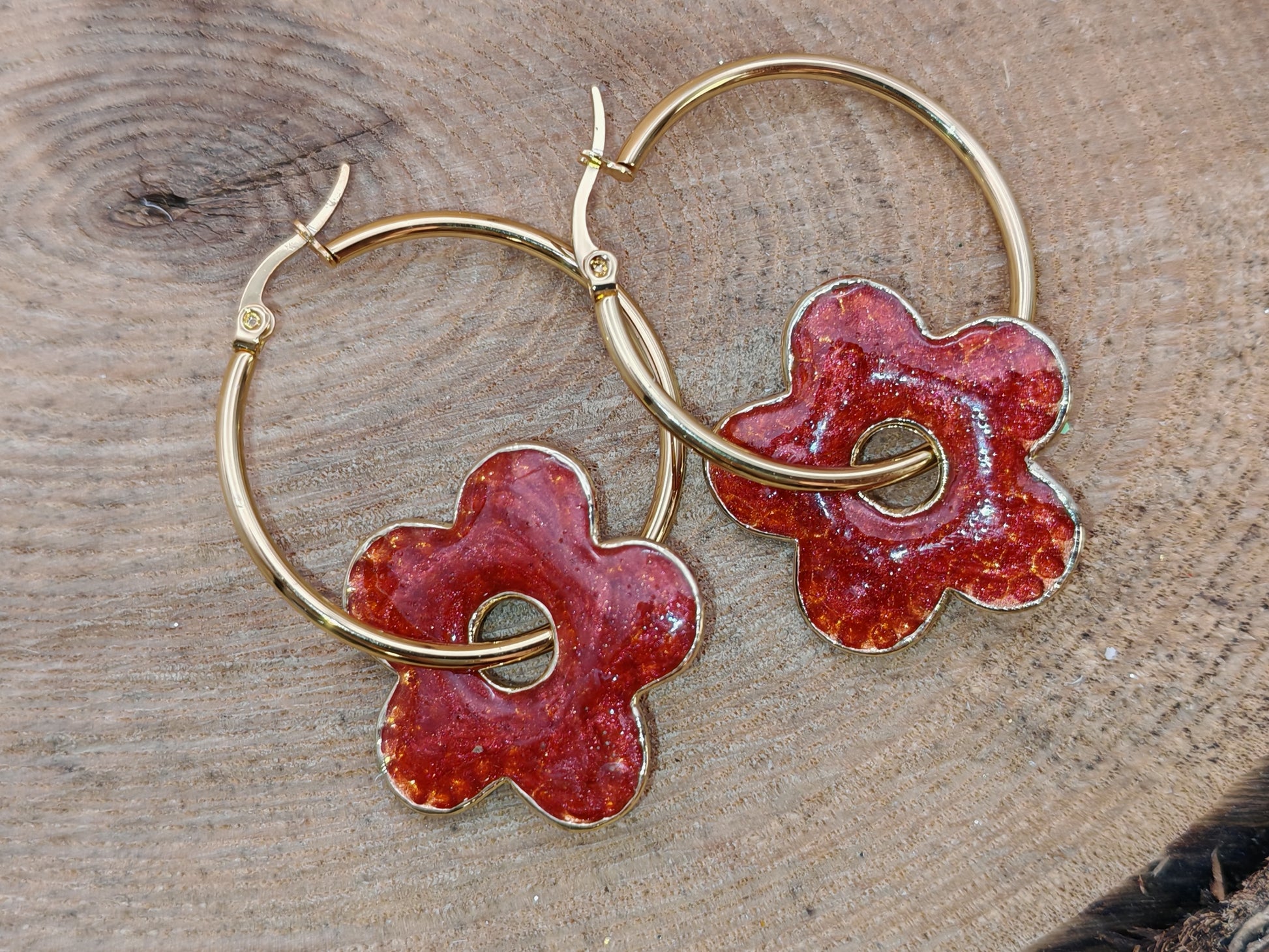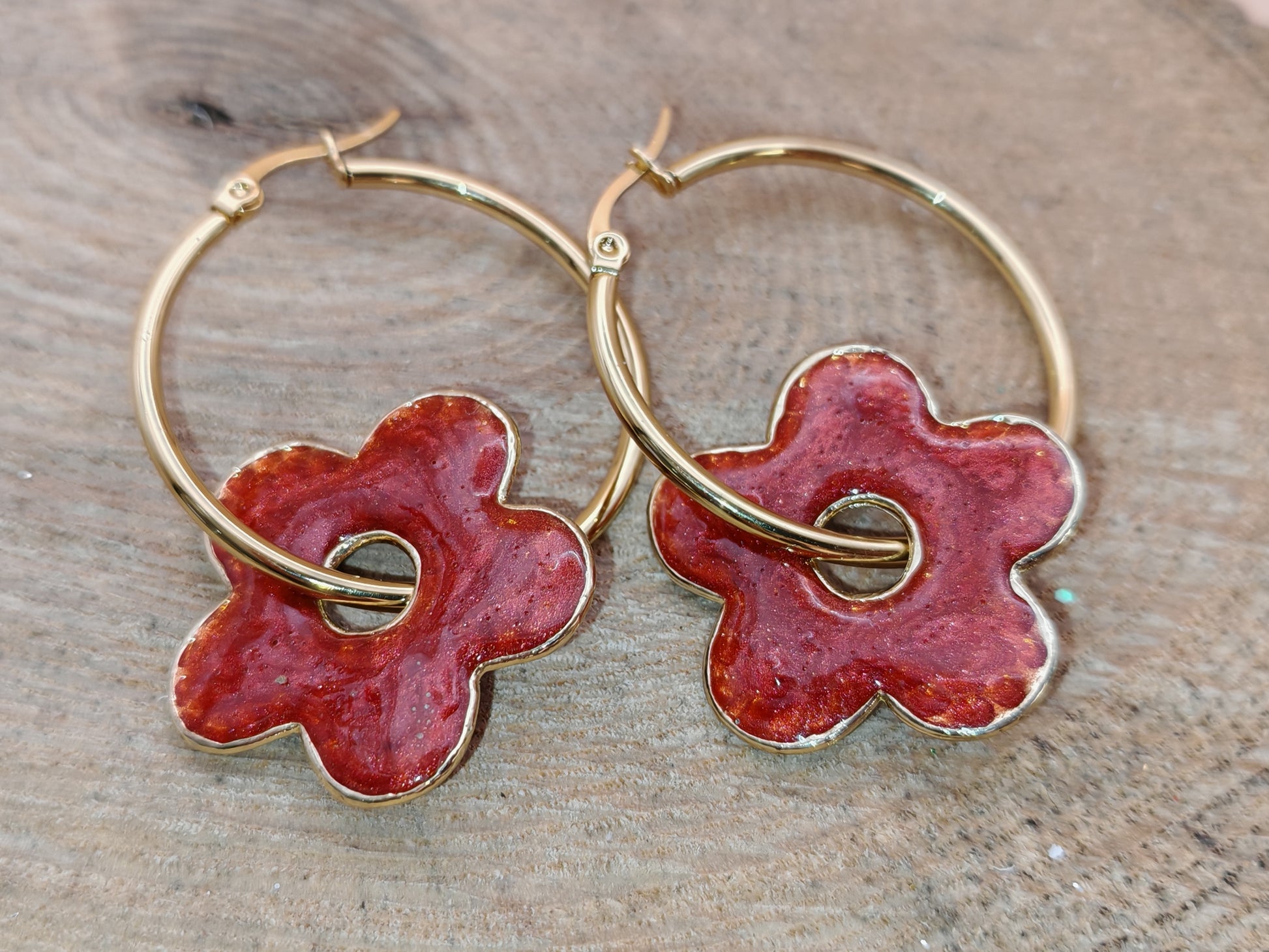 Boucles d’oreilles – Fleurs de résine rouge profond