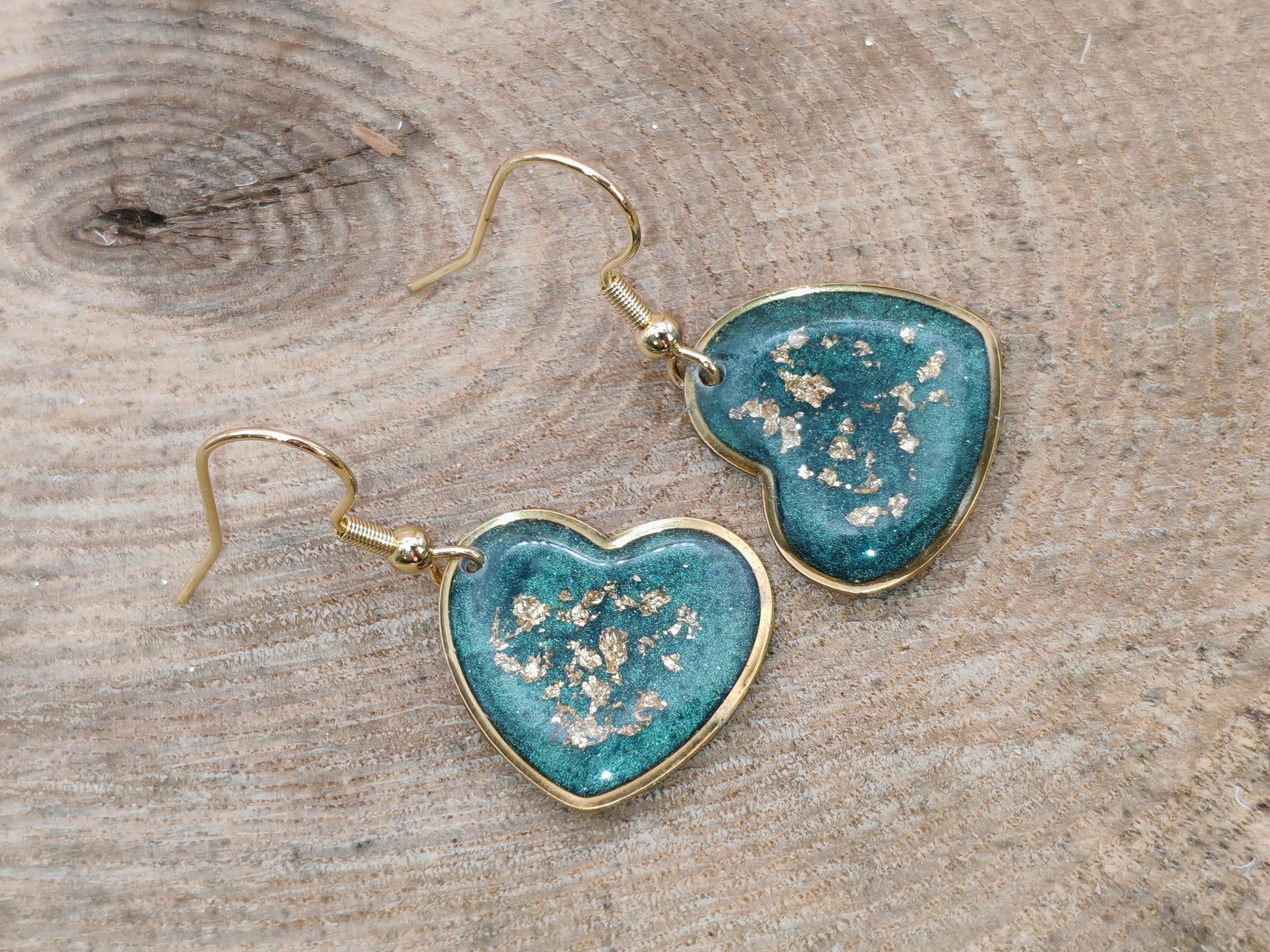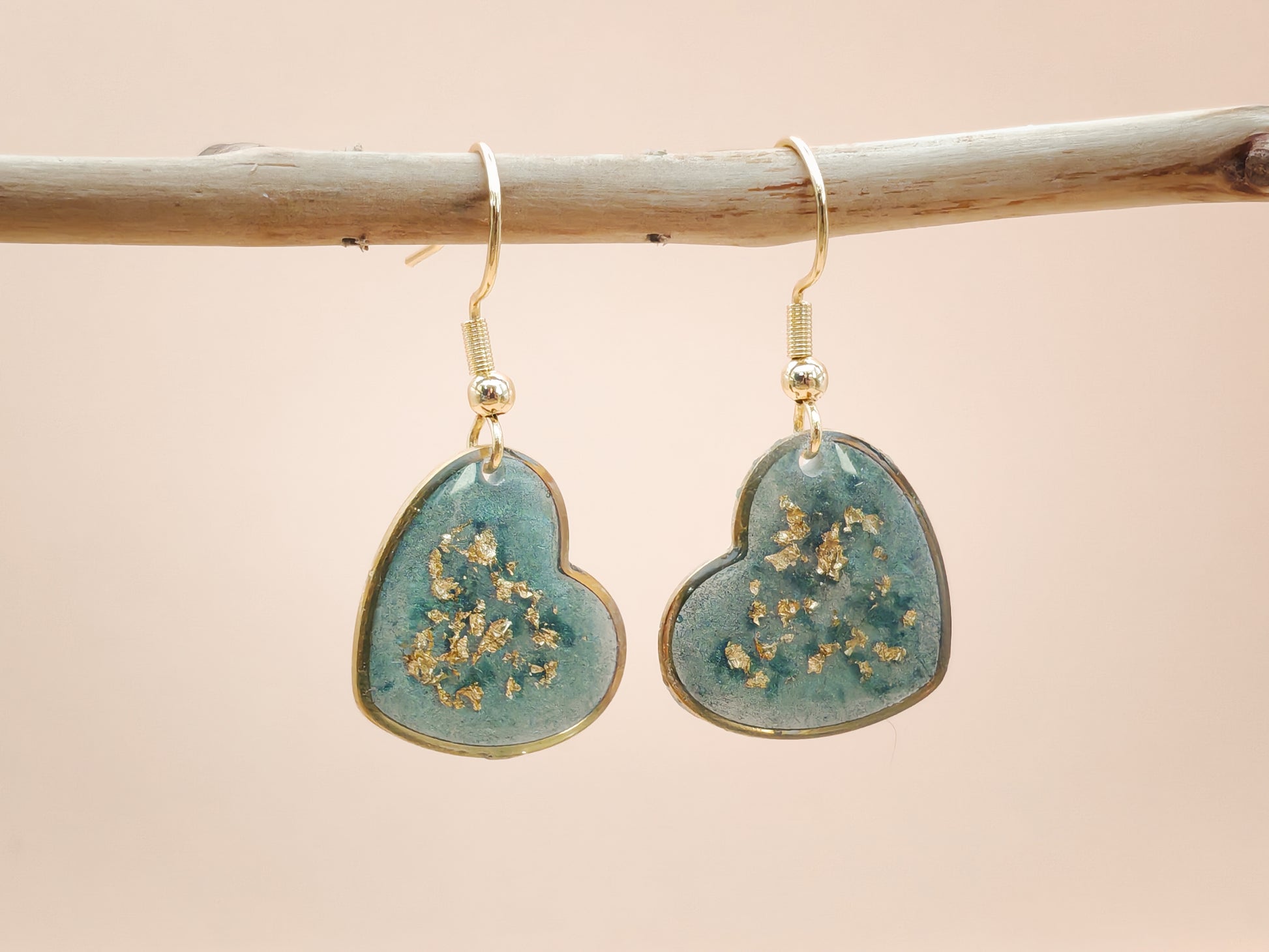 Boucles d’oreilles – Cœurs lumineux vert bleuté aux éclats dorés