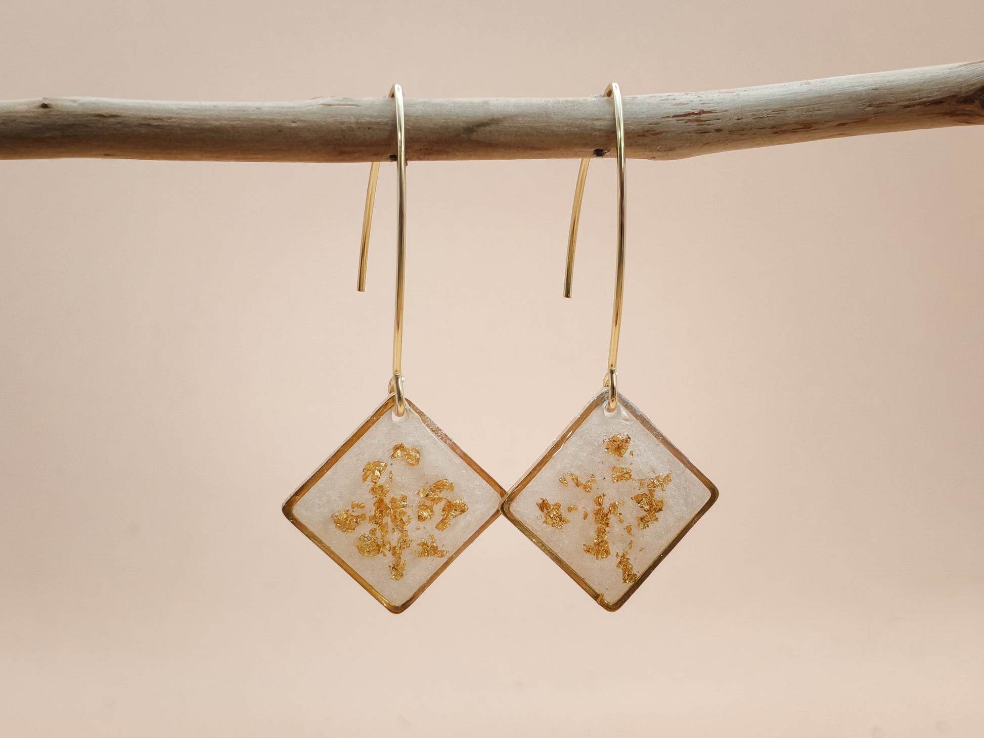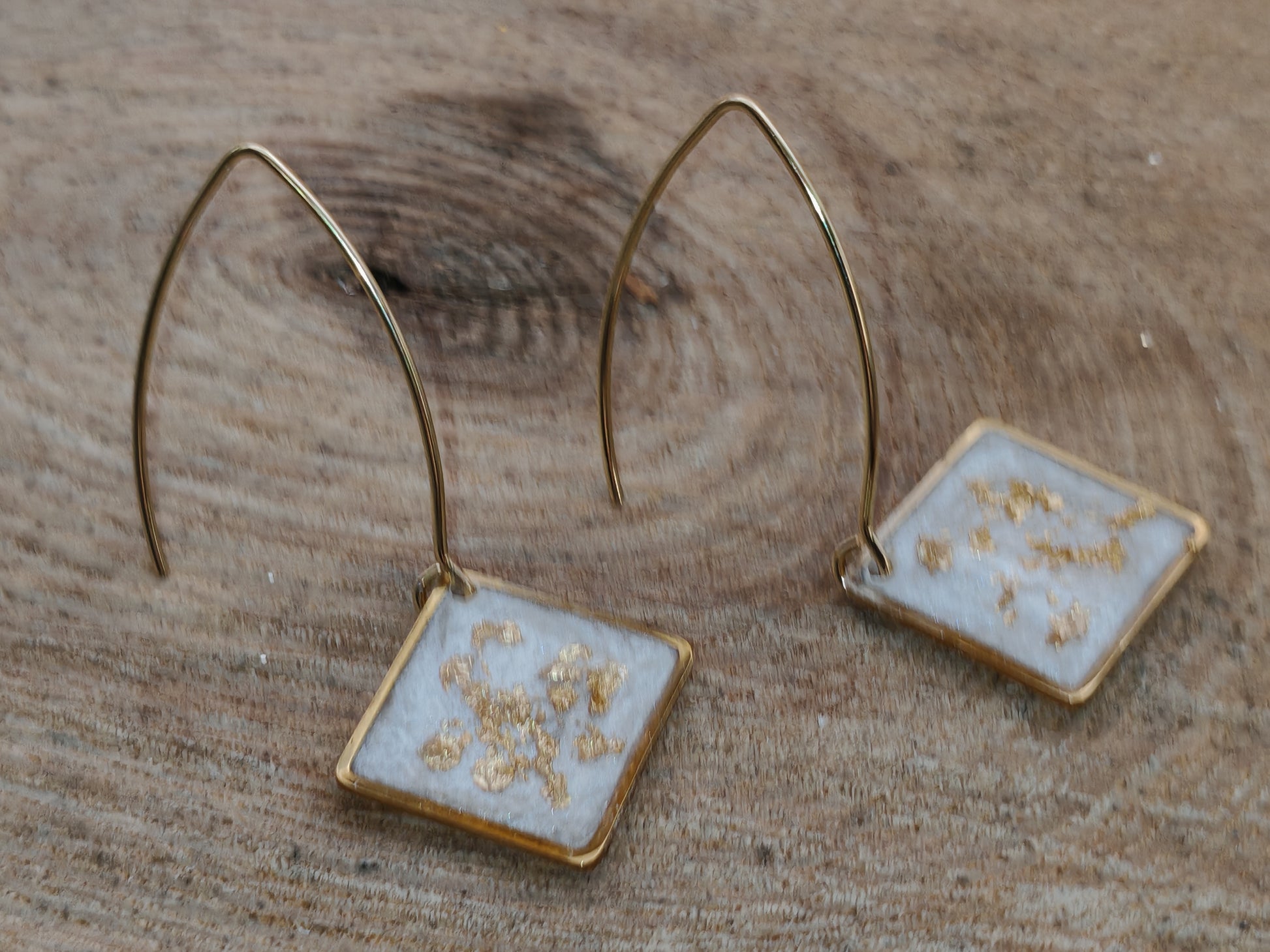 Boucles d’oreilles – Carrés lumineux blancs aux éclats dorés