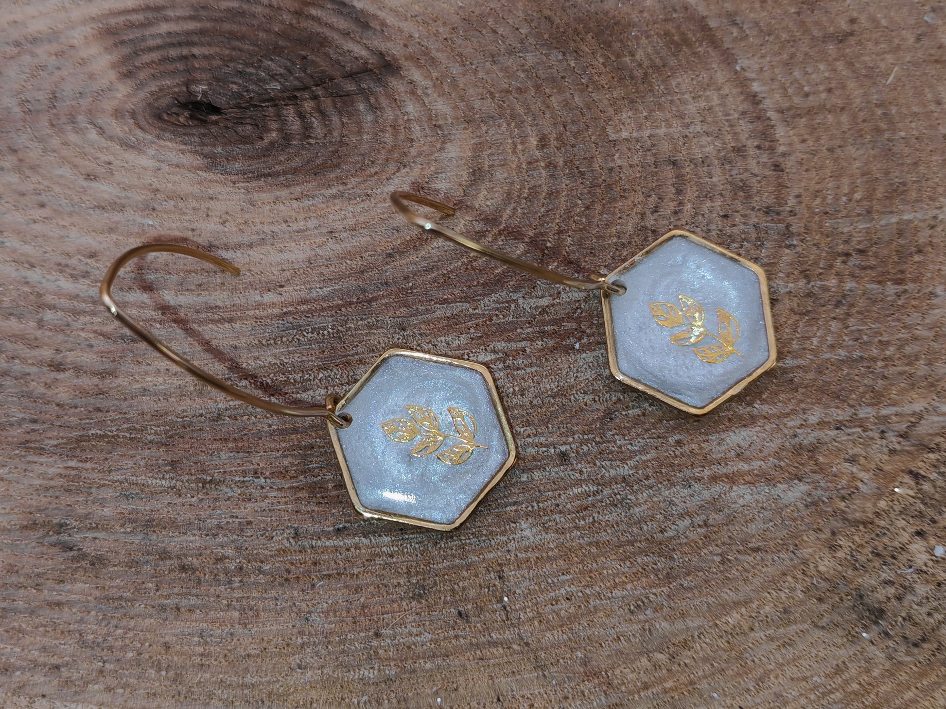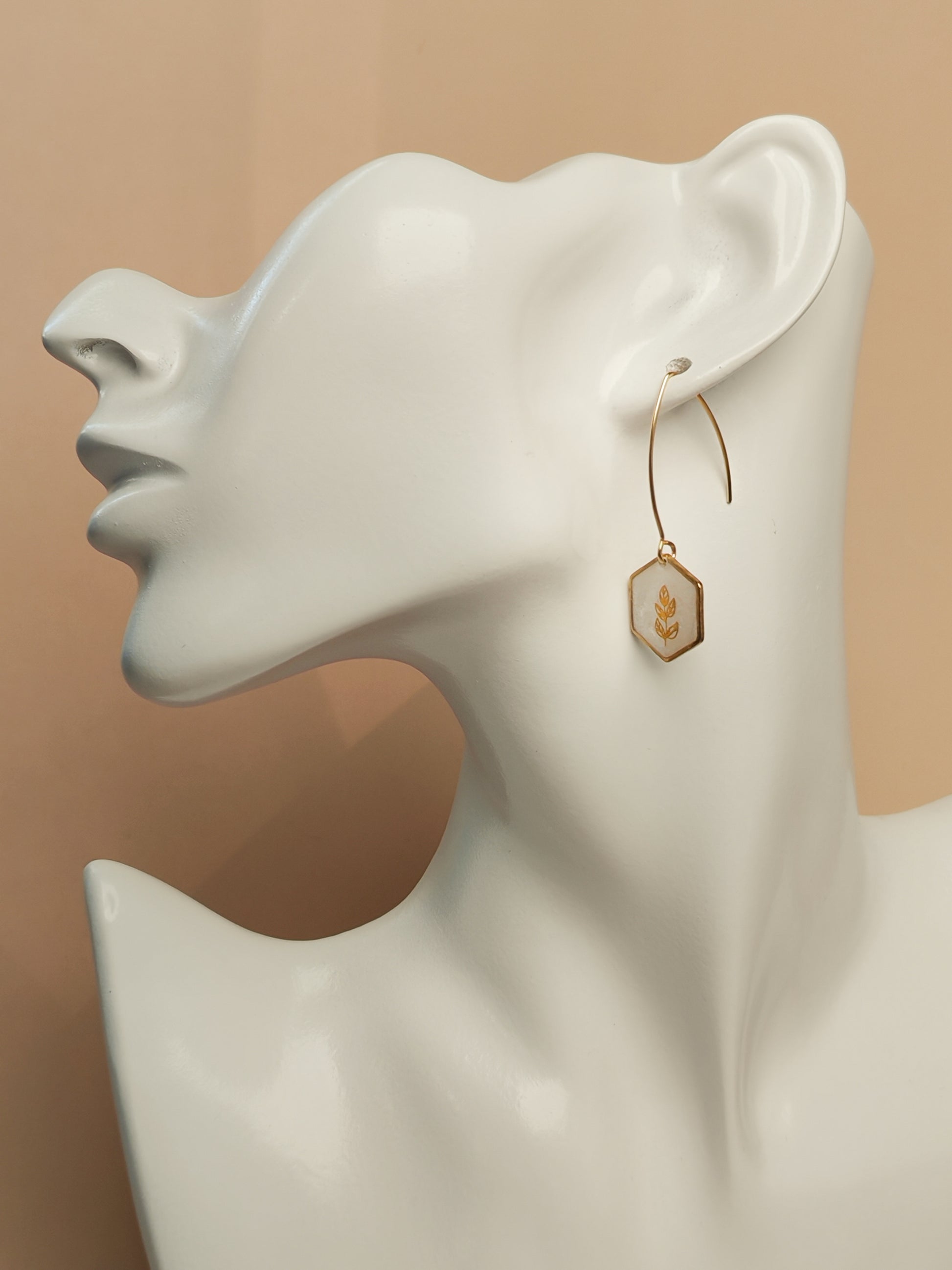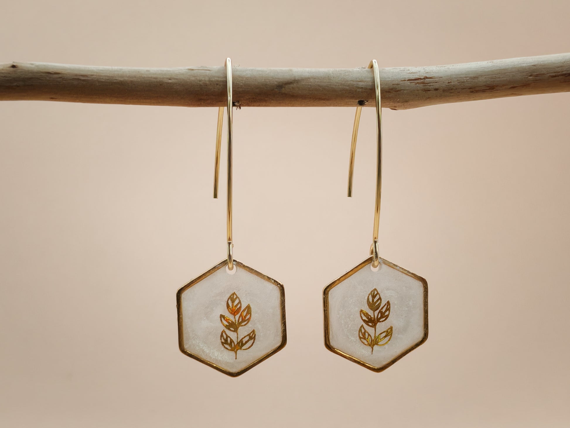Boucles d’oreilles – Hexagones blancs nacrés au feuillage doré