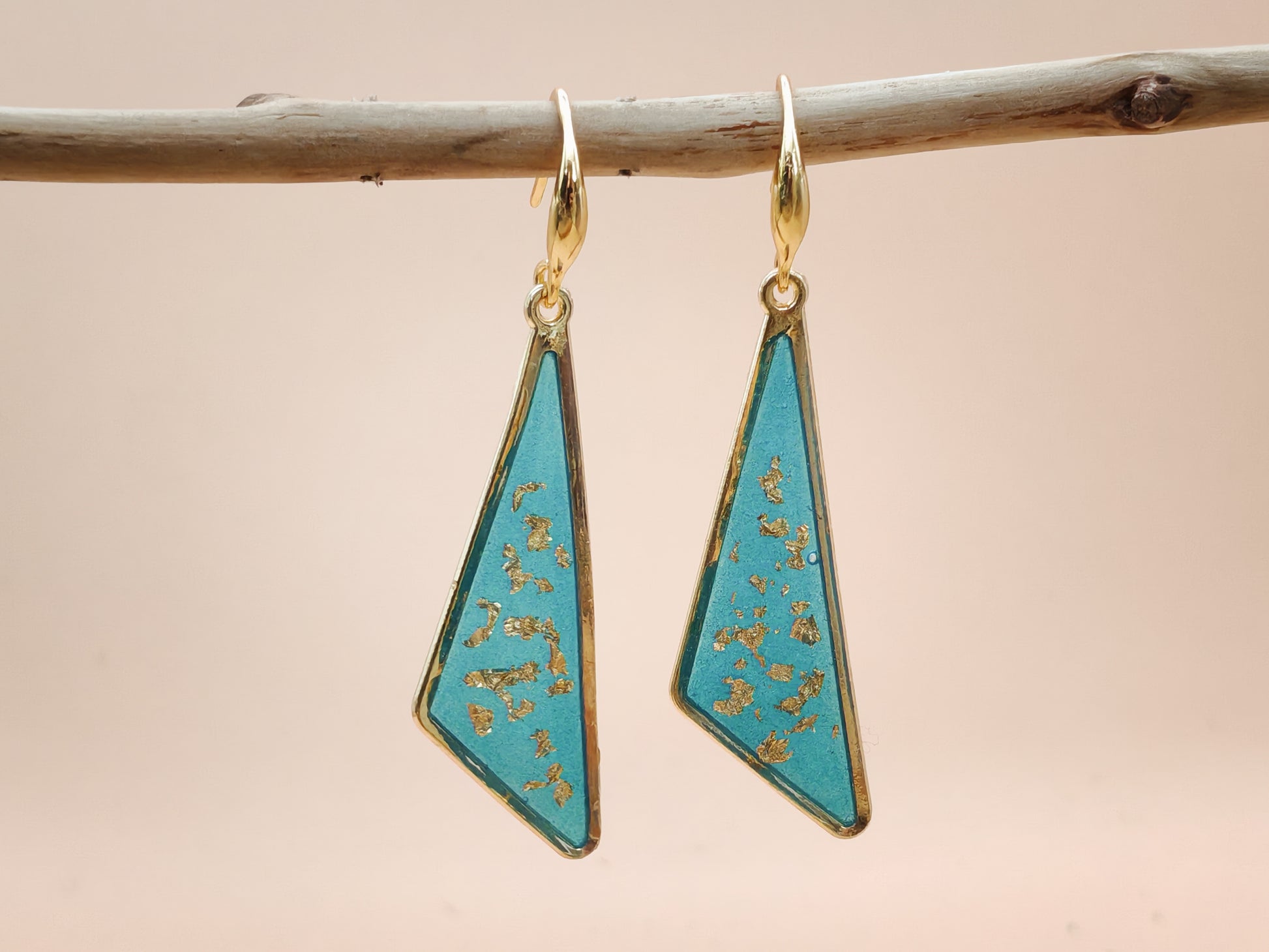 Boucles d’oreilles – Triangles bleu turquoise éclats dorés