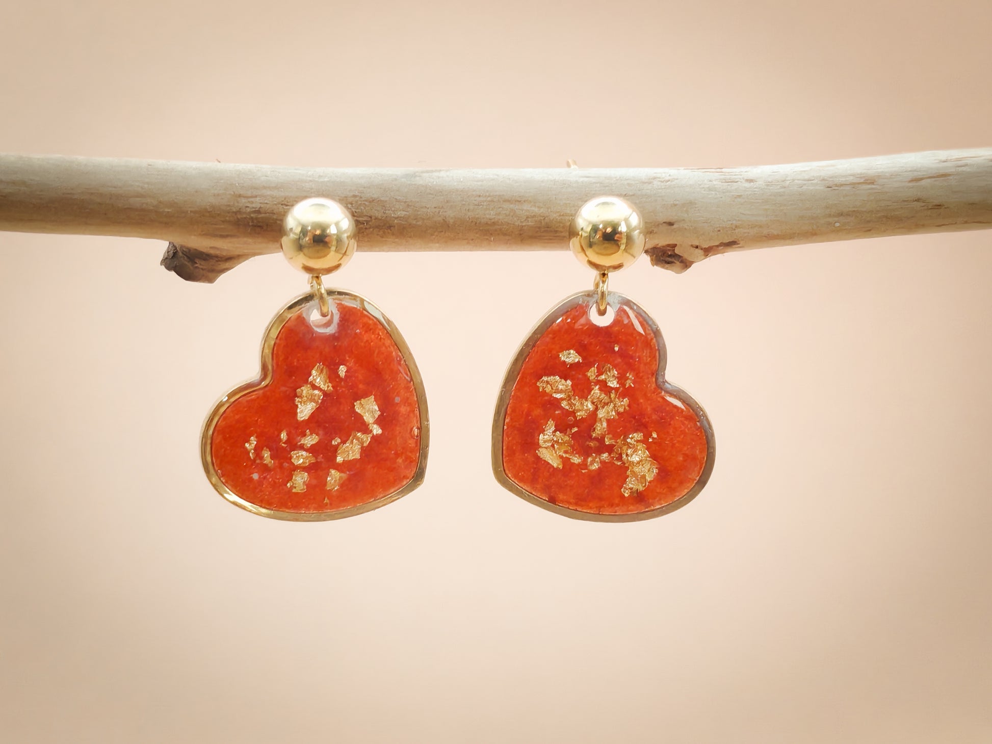 Ces clous d’oreilles en forme de cœur évoquent une chaleur douce et lumineuse, comme une braise encore vivante. Le rouge profond, enrichi d’éclats dorés, capte la lumière et révèle des reflets changeants à chaque mouvement.