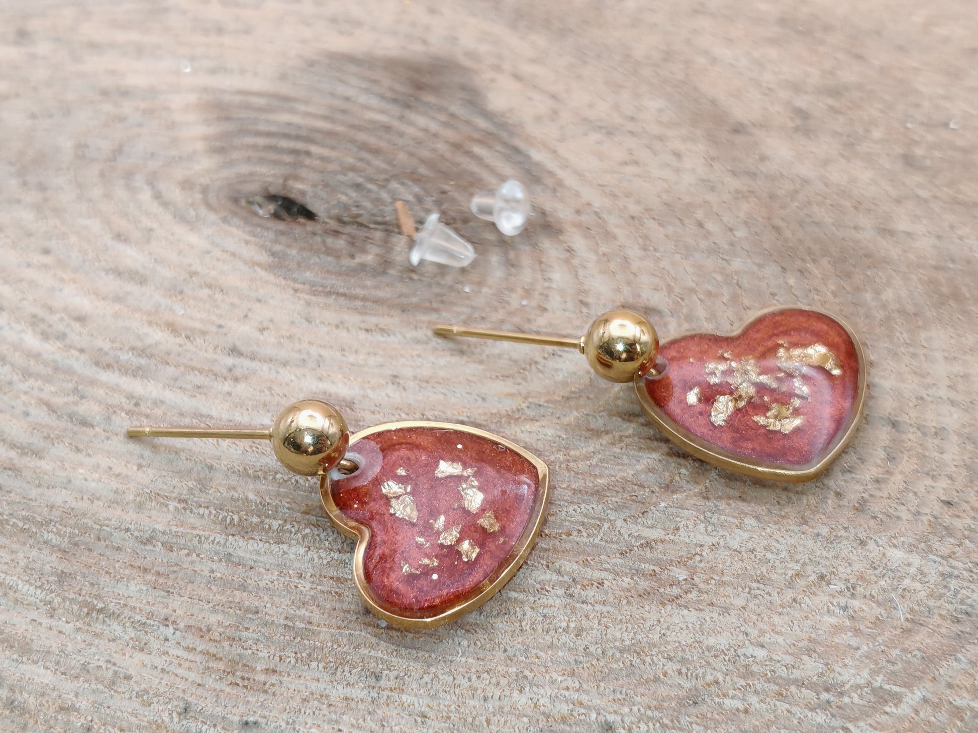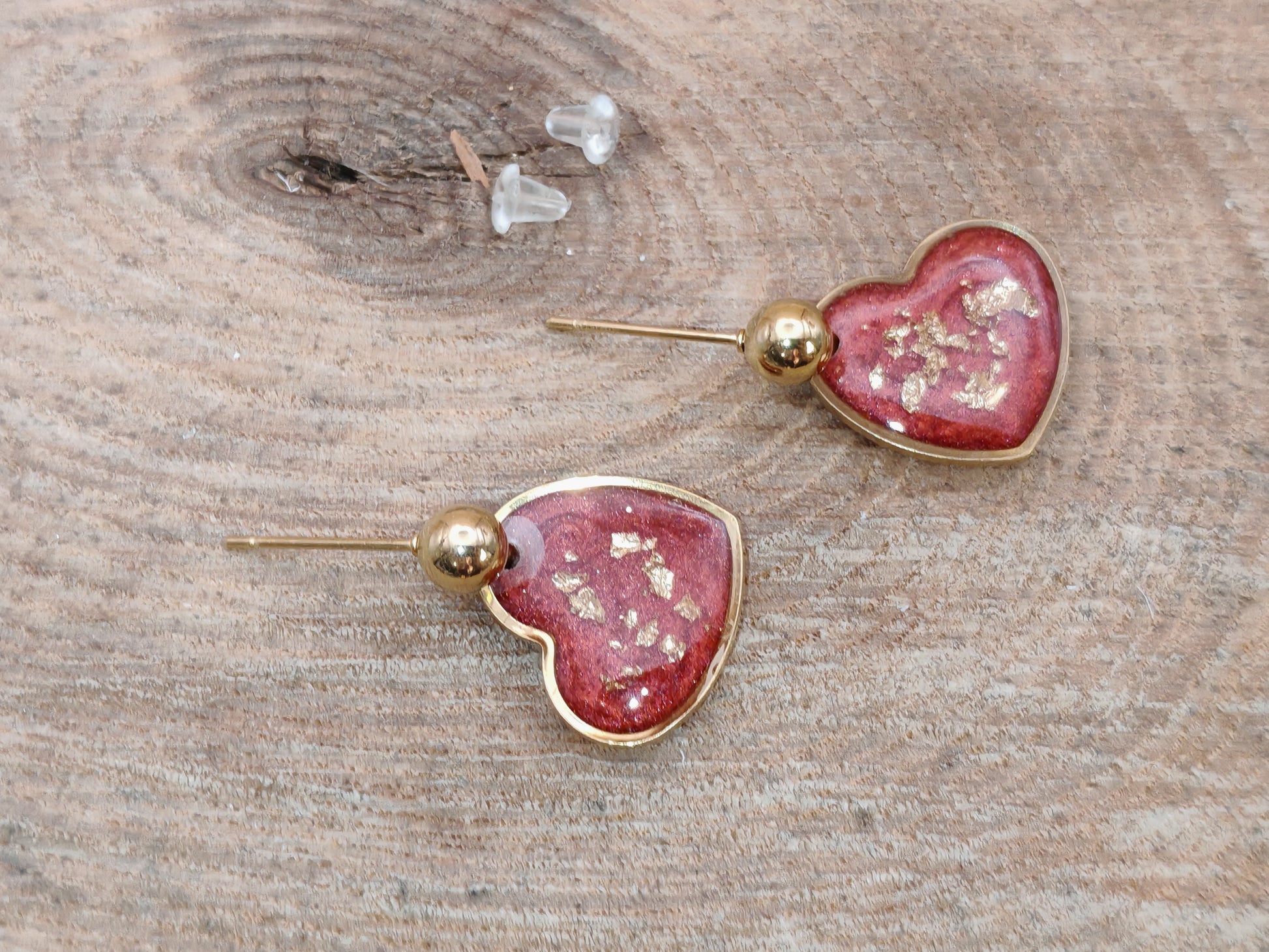 Chaque cœur mesure environ 1,5 cm de large. Le visuel est réalisé en résine colorée, parsemée de touches dorées, puis recouvert d’une résine transparente pour une finition lisse et brillante.