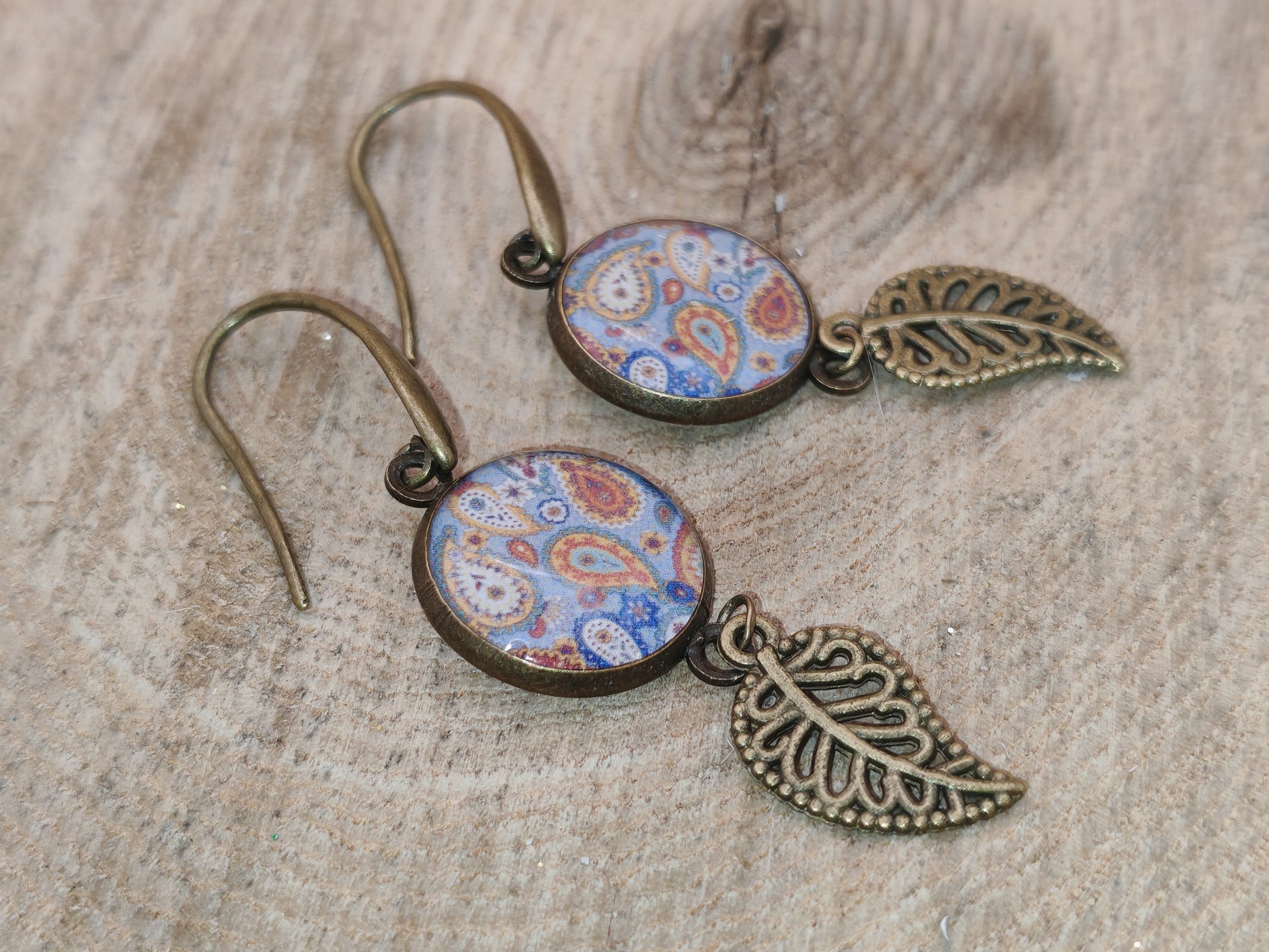 Chaque boucle est composée d’un cabochon rond de 14 mm de diamètre, dévoilant un décor de gouttes et d’arabesques aux teintes bleu, écru et ocre, protégé sous résine pour une belle profondeur. Une breloque feuille en métal de couleur bronze, suspendue sous le cabochon, apporte mouvement et légèreté à l’ensemble.