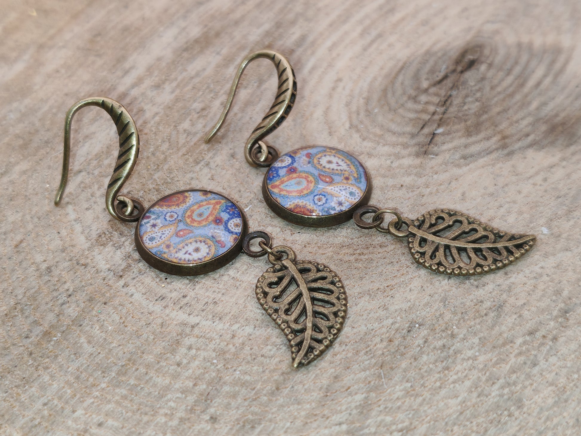 Ces boucles d’oreilles dévoilent un délicat motif cachemire aux nuances chaleureuses, posé sur un fond bleuté doux. Le cabochon rond attire le regard par ses arabesques raffinées, tandis qu’une fine feuille ajourée prolonge le bijou avec légèreté et mouvement.