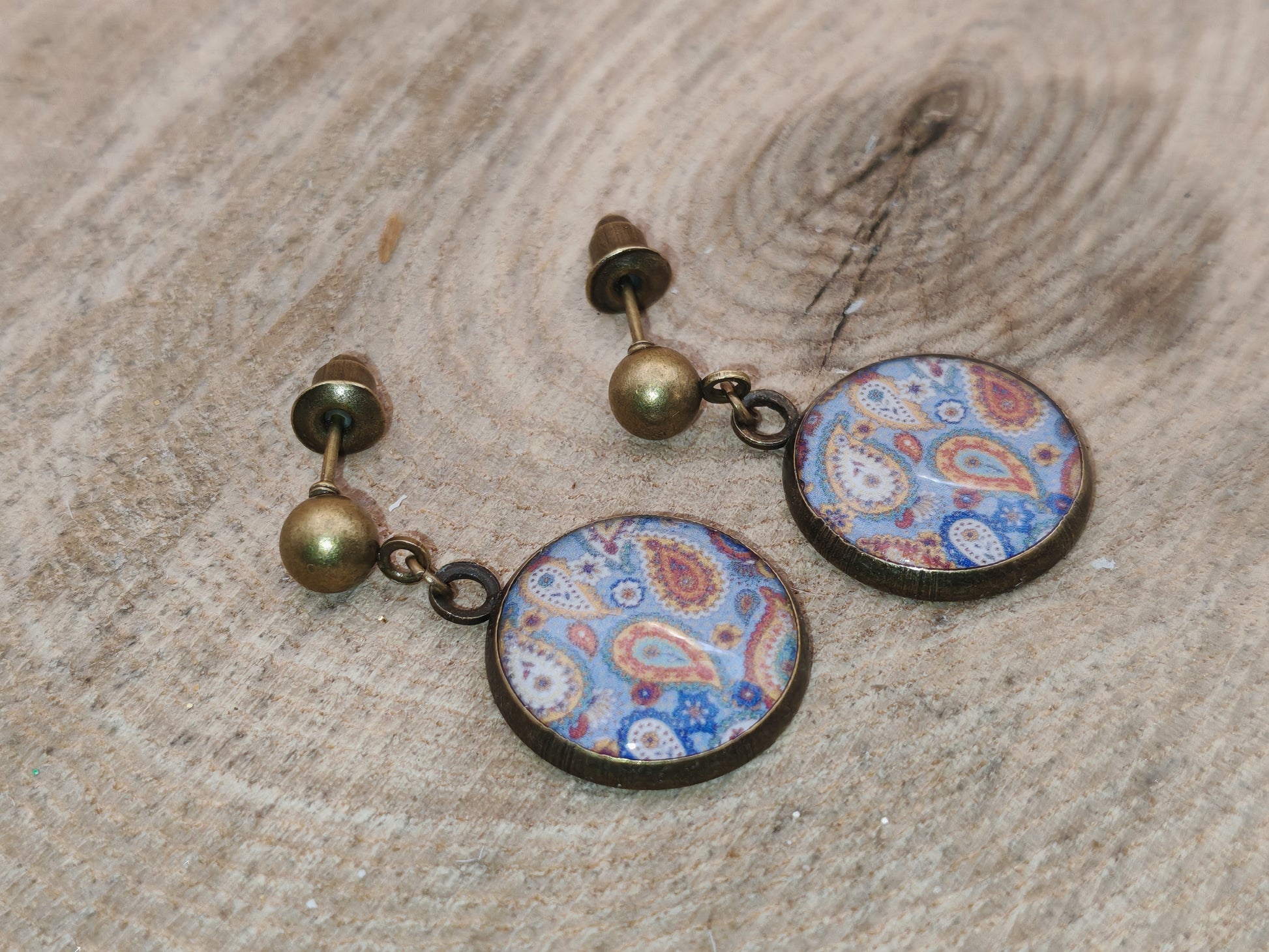 Ces boucles d’oreilles mettent en lumière un motif cachemire délicatement travaillé, aux teintes chaudes et nuancées, qui se détachent sur un fond bleu doux et lumineux. Chaque cabochon révèle un jeu d’arabesques inspiré des étoffes orientales, évoquant des tissus précieux et des voyages feutrés.