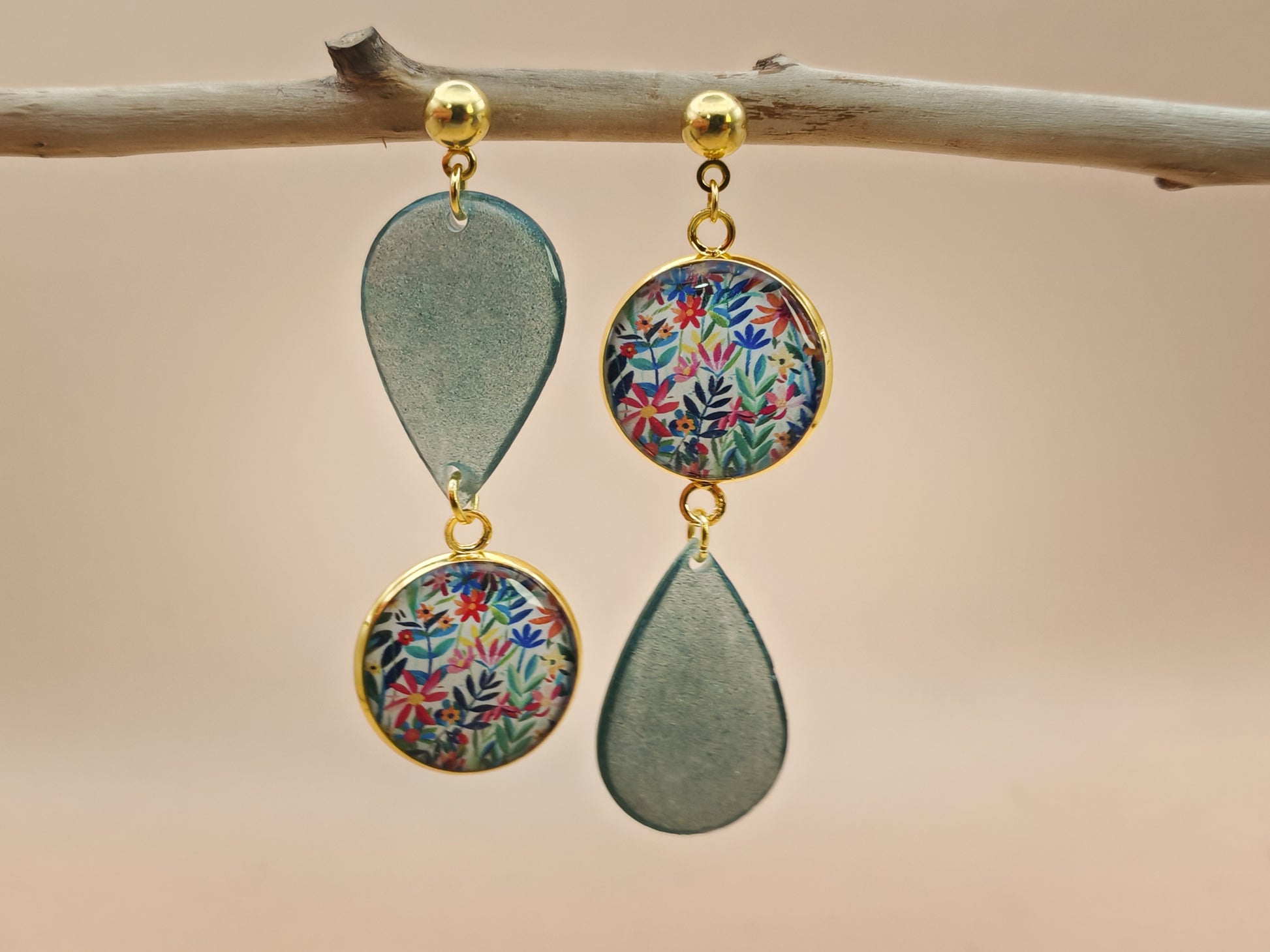 Ces boucles d’oreilles associent un cabochon rond de 16 mm au motif floral dense et coloré, composé de petites fleurs et de feuillages multicolores sur fond clair, à un élément en résine de forme goutte. La résine présente une teinte vert profond légèrement irisée, avec un effet marbré qui capte délicatement la lumière.