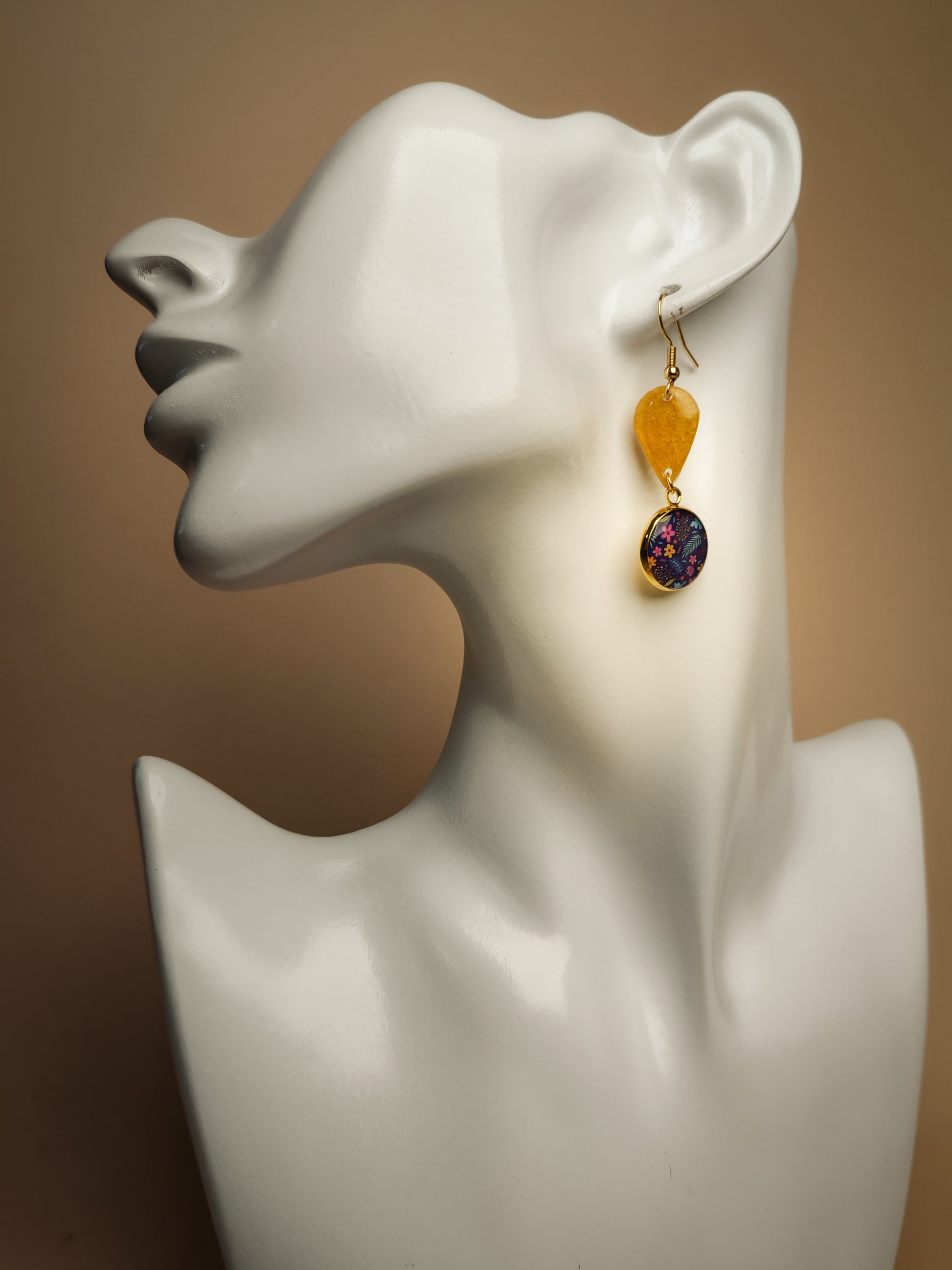 Ces boucles d’oreilles associent un cabochon rond de 14 mm au motif floral dense et coloré, composé de petites fleurs roses, jaunes et feuillages stylisés aux nuances turquoise et vert d’eau sur un fond bleu profond, à un élément en résine de forme goutte. La résine présente une teinte jaune doré lumineuse, subtilement pailletée, avec un effet translucide qui capte la lumière.