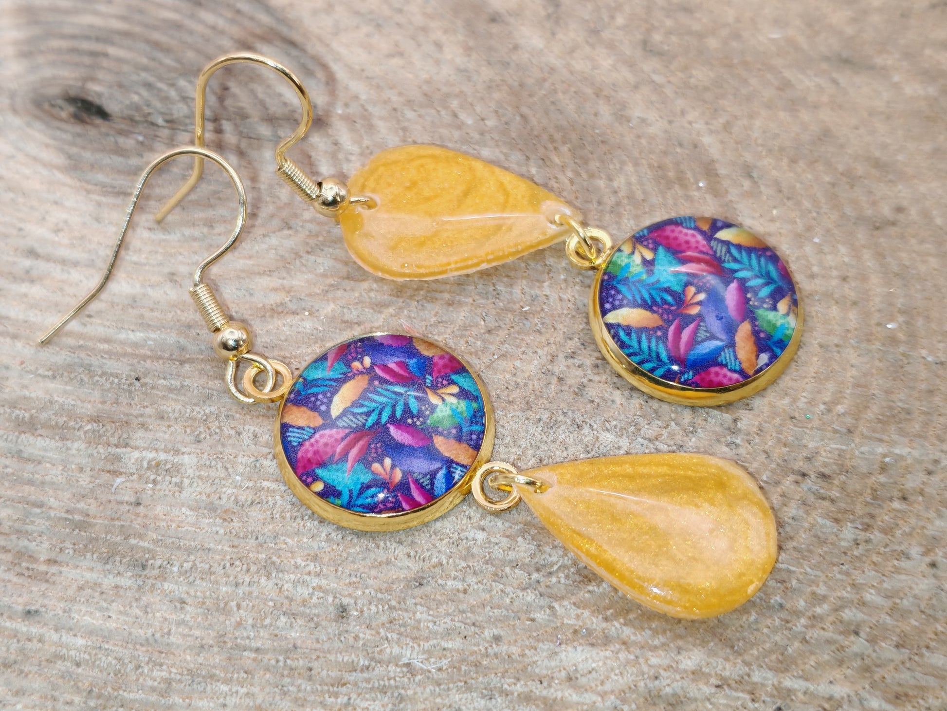 Ces boucles d’oreilles associent un cabochon rond de 14 mm au motif végétal dense et coloré, mêlant feuilles stylisées aux teintes turquoise, rose, violet et ocre sur un fond bleu profond, à un élément en résine de forme goutte. La résine présente une teinte jaune doré lumineuse, finement pailletée, avec un effet translucide qui reflète subtilement la lumière.