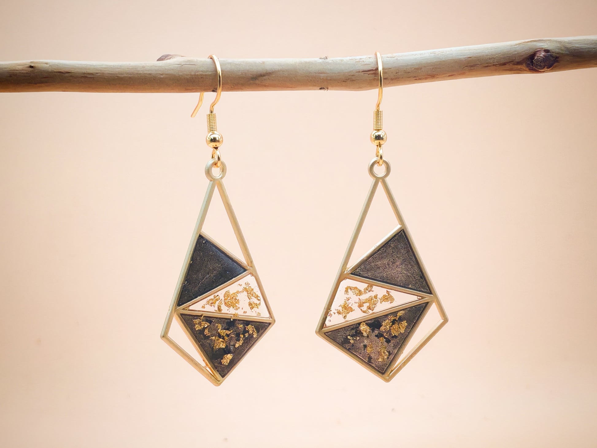 Ces boucles d’oreilles jouent avec les lignes et les contrastes : une structure géométrique dorée encadre des triangles en résine noire, dont certains sont parsemés de fines feuilles d’or, visibles des deux côtés pour un rendu lumineux sous tous les angles.