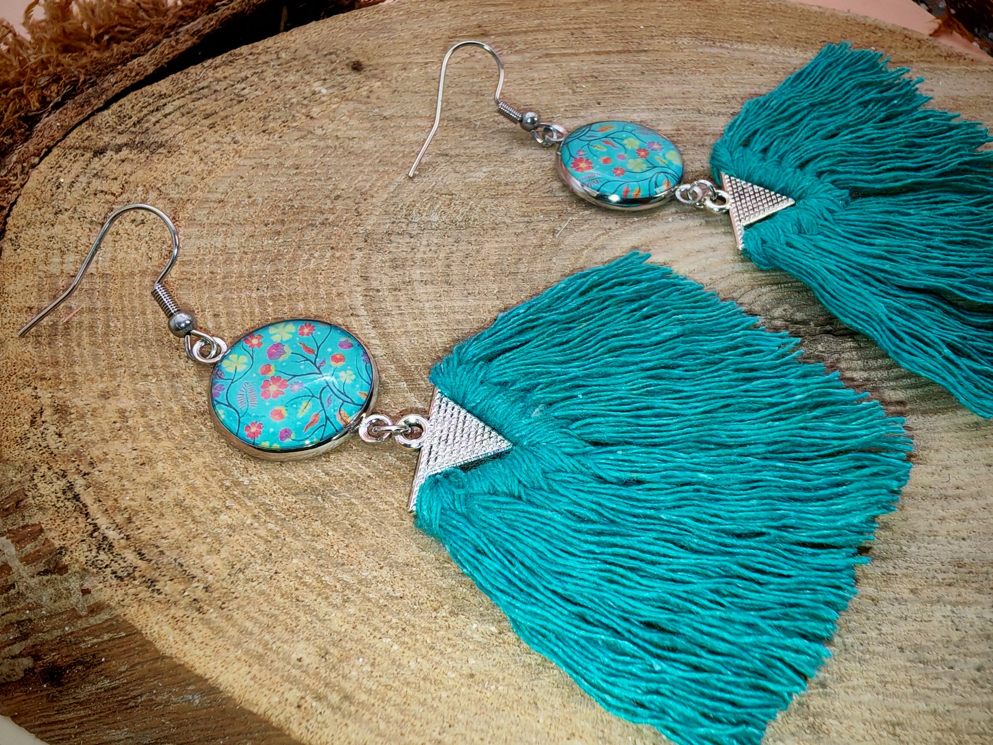 Ces boucles d’oreilles marient un cabochon rond de 16 mm au fond turquoise lumineux, parsemé de délicates fleurs corail et rose, à une pampille en macramé vert turquoise aux longues franges souples.