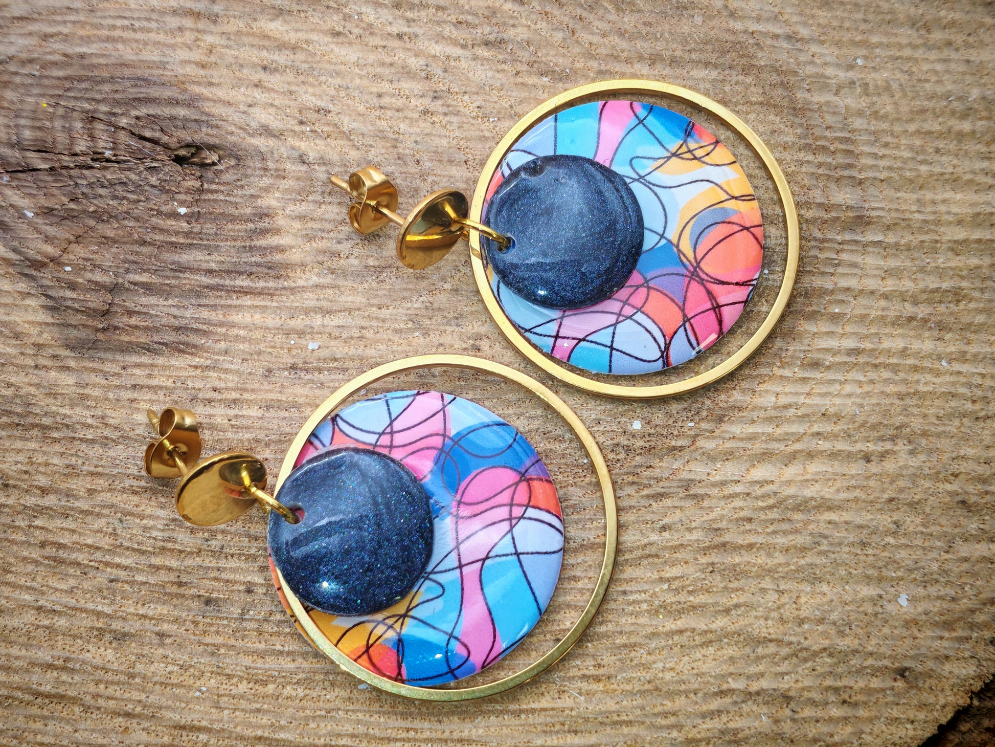 Au centre d’un anneau doré de 3 cm de diamètre, un motif recto verso de 2,5 cm dévoile un fond aux teintes vives de bleu, rose, orange et touches pastel, traversé de lignes fines et entrelacées. Cet effet graphique apporte du mouvement et une touche artistique contemporaine, comme une toile abstraite en miniature.