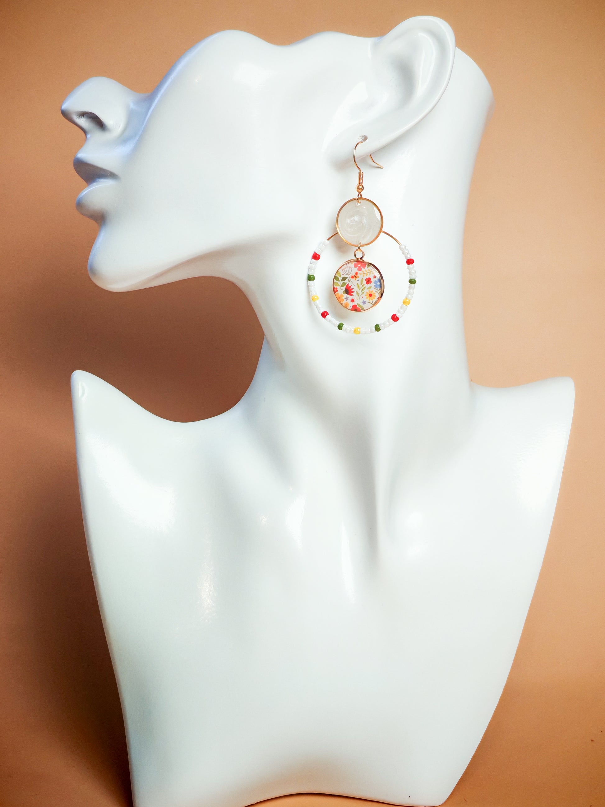Suspendu en dessous, un cabochon rond présente un motif floral éclatant dans les tons rouge, bleu, vert et jaune, mis en valeur par des perles coordonnées pour une composition douce et colorée. Les crochets sont en acier inoxydable.