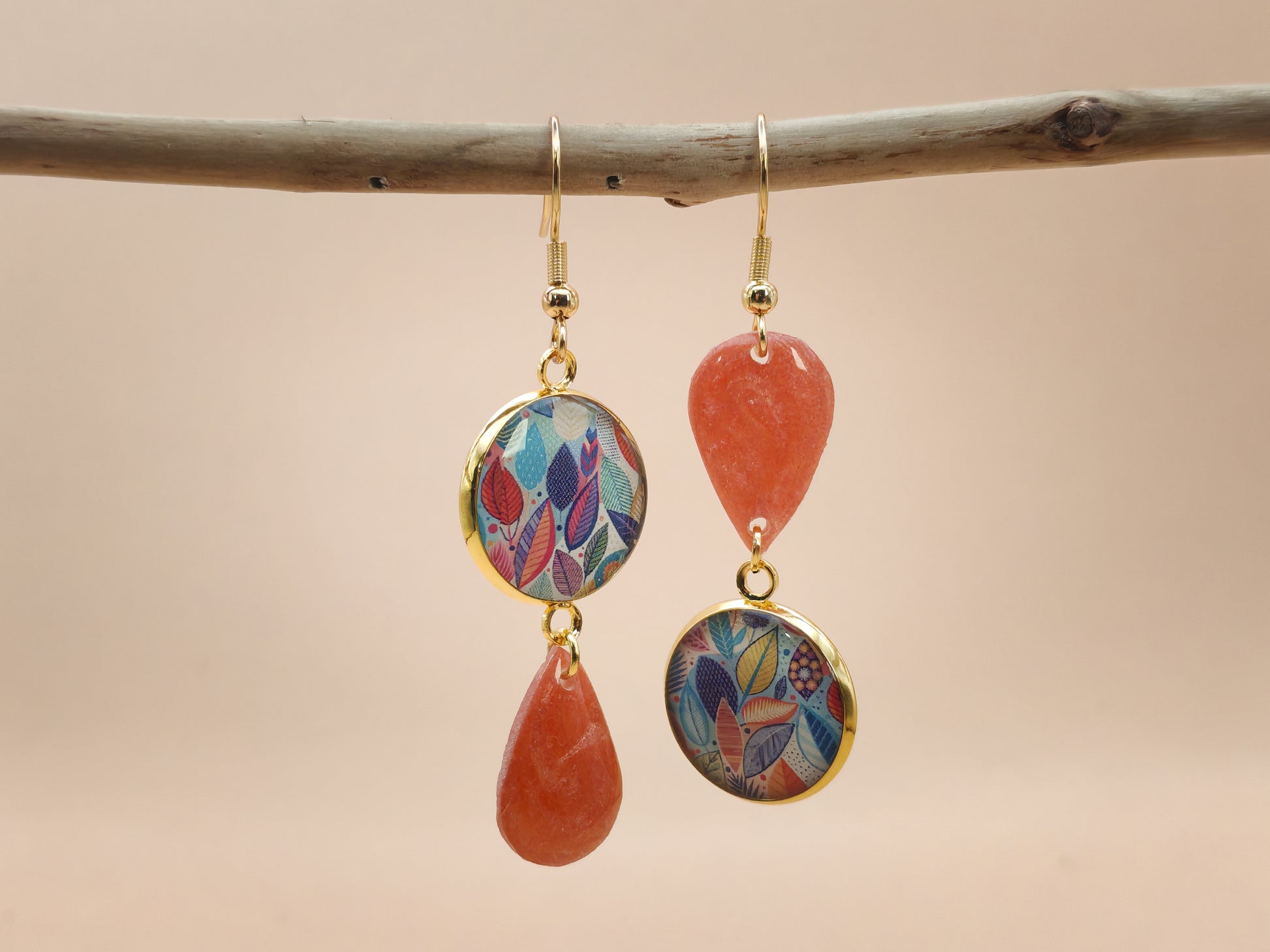 Ces boucles d’oreilles mettent en valeur un cabochon rond de 16 mm orné d’un motif végétal aux feuilles stylisées, déclinées dans des tons doux de rose, lilas, turquoise et bleu. Le fond clair illumine l’ensemble et apporte une sensation de fraîcheur et de légèreté.