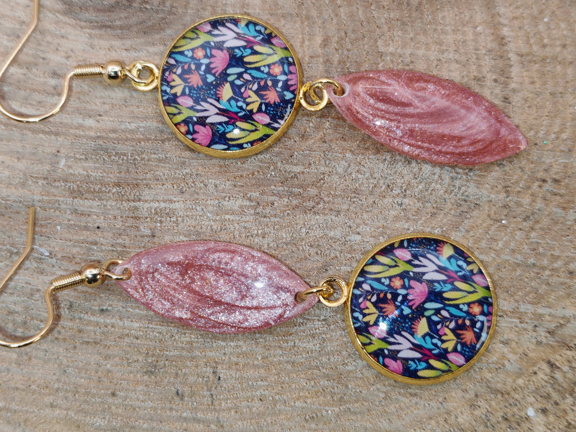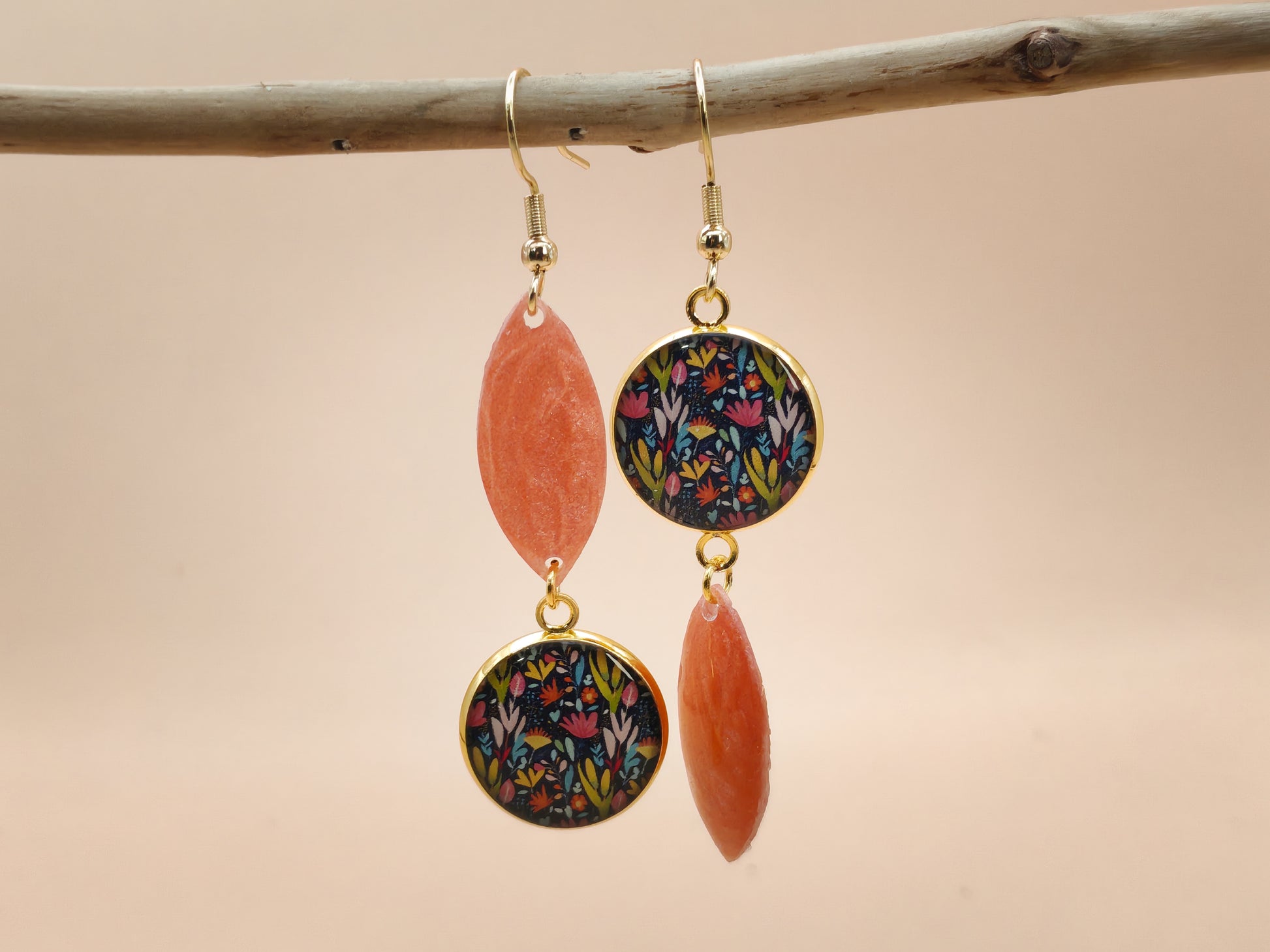 Ces boucles d’oreilles mettent en valeur un cabochon rond de 16 mm orné d’un motif végétal foisonnant, où se mêlent feuilles stylisées et touches florales dans des teintes de rose, de jaune, de vert et de bleu sur fond sombre. L’ensemble est associé à un élément allongé en résine rosée, délicatement marbrée et pailletée, qui capte la lumière avec subtilité.