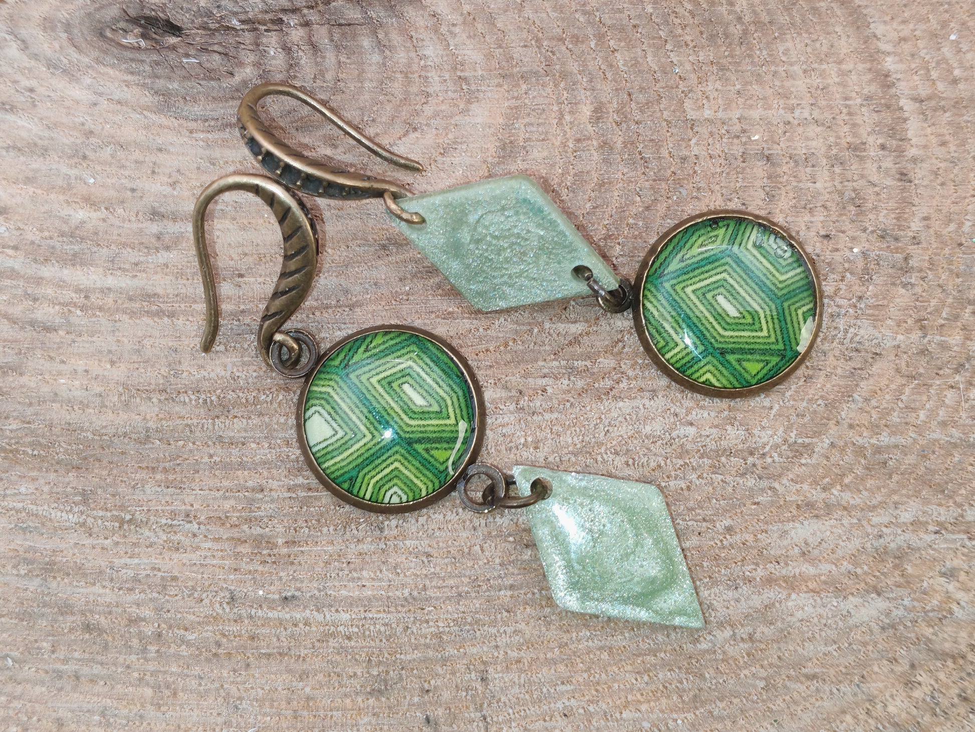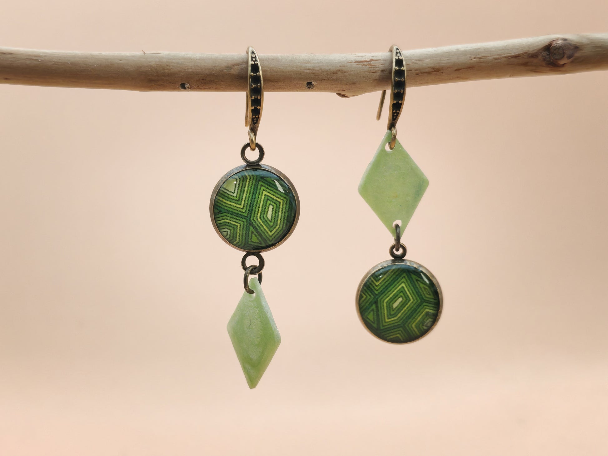 Ces boucles d’oreilles associent un cabochon rond de 12 mm de diamètre au motif géométrique végétal, composé de lignes graphiques vertes aux nuances profondes et contrastées, à un élément en résine de forme losange. La résine présente une teinte vert tendre légèrement irisée, avec un effet marbré discret qui capte la lumière avec douceur.