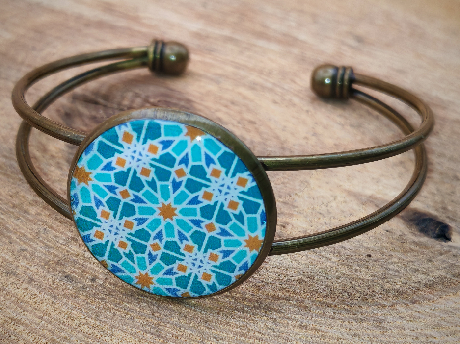 Le bracelet assorti est orné d’un cabochon de 25 mm de diamètre, serti sur un jonc en métal de couleur bronze. Il est ajustable et s’adapte facilement à la plupart des poignets.