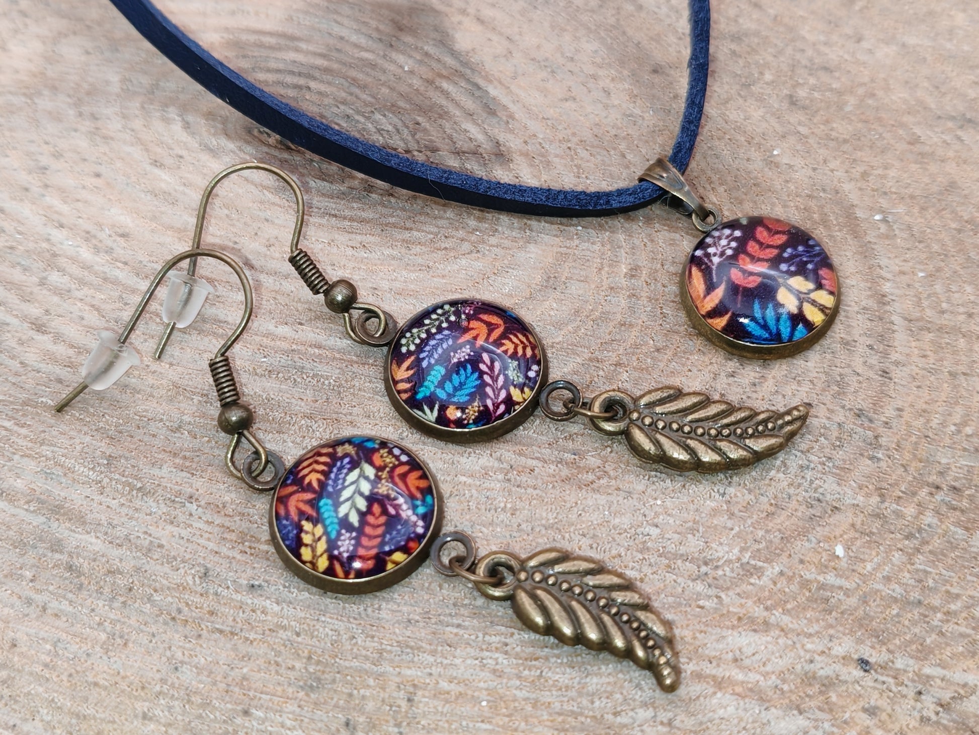 Un éclat de nature sauvage s’exprime dans cet ensemble fait main, composé de boucles d’oreilles assorties à leur pendentif, où des feuilles colorées s’entrelacent sur un fond bleu nuit profond.