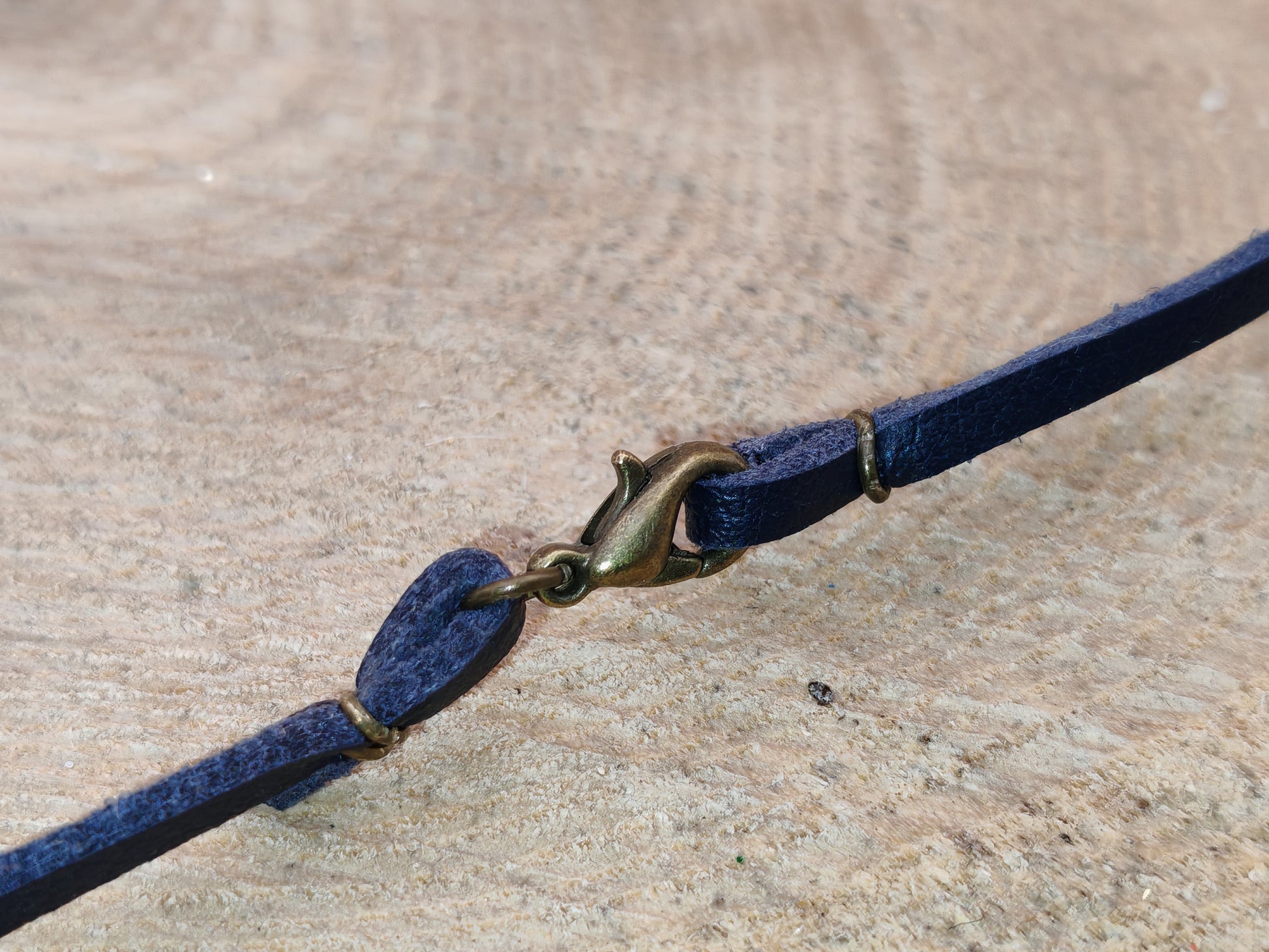Le pendentif reprend le même cabochon de 12 mm, protégé par une résine brillante, et est monté sur un cordon en suédine bleu marine, doux et souple, fermé par un fermoir métallique de couleur bronze.