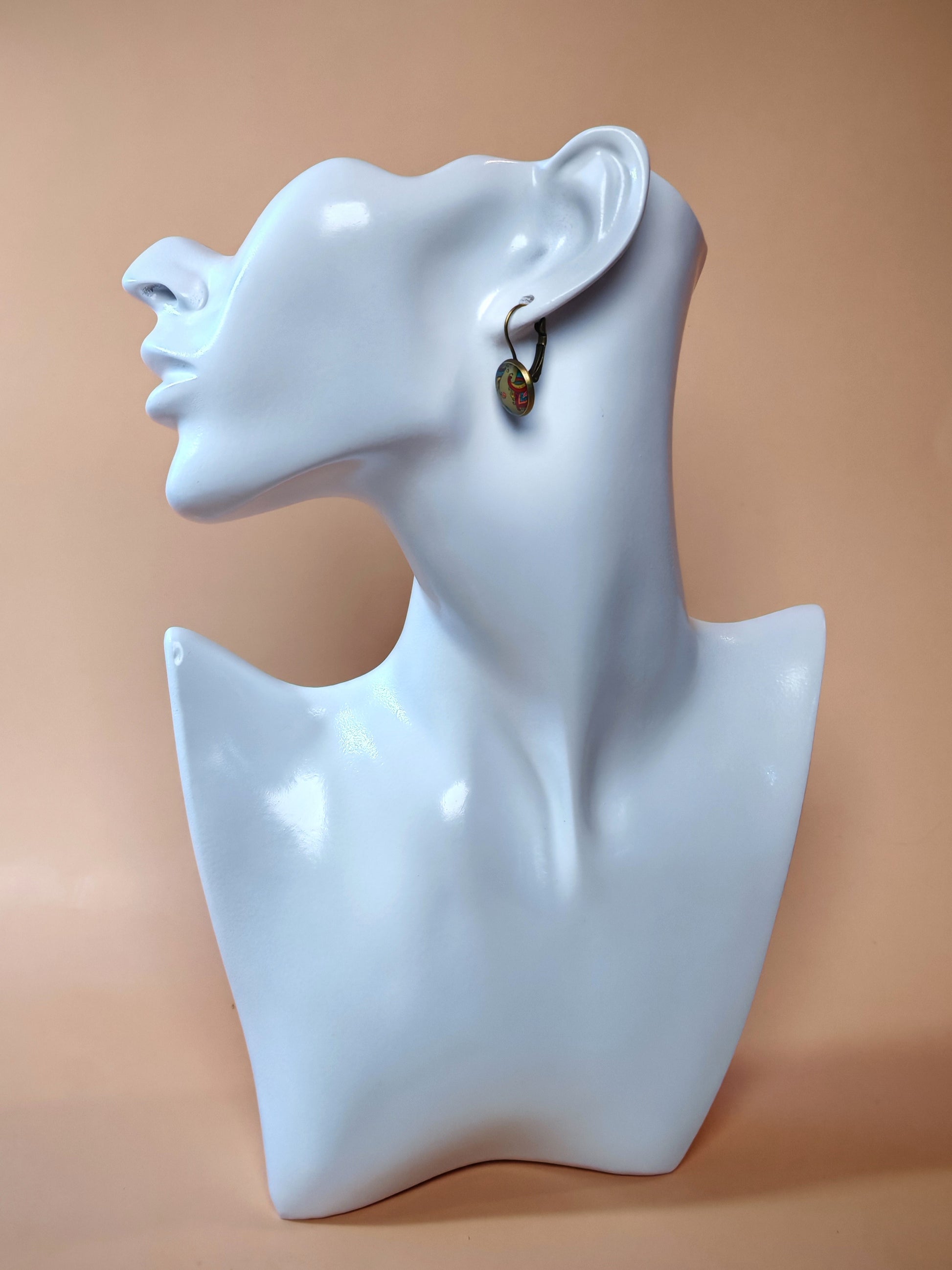 Ces boucles d’oreilles dormeuses dévoilent un délicat motif floral aux accents bohèmes, mêlant rouge, turquoise, bleu profond et touches de jaune sur un fond vert doux et naturel.