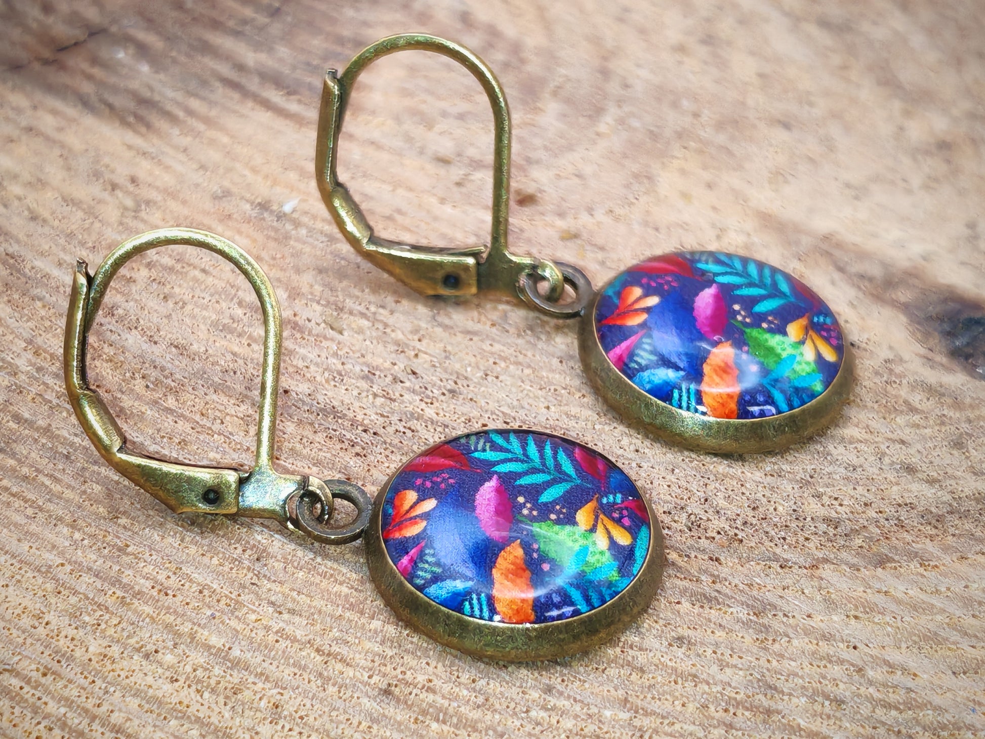 Un univers féérique et nocturne s’invite dans ces boucles d’oreilles, où de petits champignons fluorescents poussent au creux d’une forêt imaginaire. Sur un fond bleu nuit profond, les teintes éclatantes — fuchsia, orange, vert anis, turquoise ou violet électrique — surgissent comme autant de lucioles dans l’obscurité. Chaque cabochon en résine de 12 mm dévoile un motif riche en détails et en émerveillement.