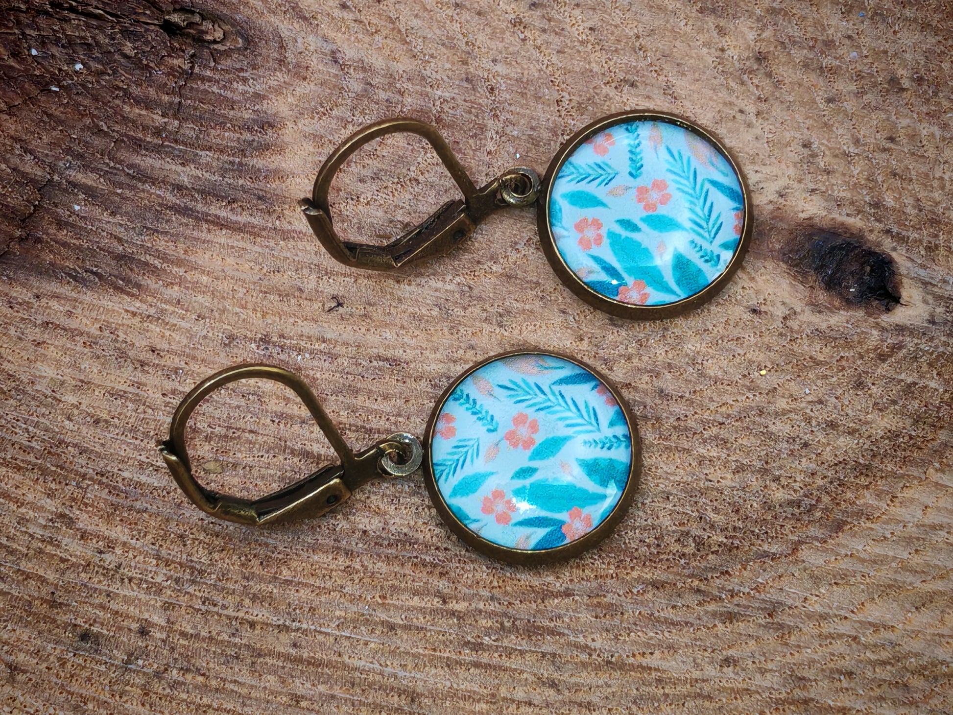 Évoquant une clairière paisible au petit matin, ces boucles d’oreilles diffusent une sensation de pureté et de douceur. Sur un fond bleu ciel brumeux, de petites fleurs corail et des feuillages bleu-vert composent un tableau végétal apaisant. Chaque cabochon en résine de 12 mm révèle un motif discret et délicat.