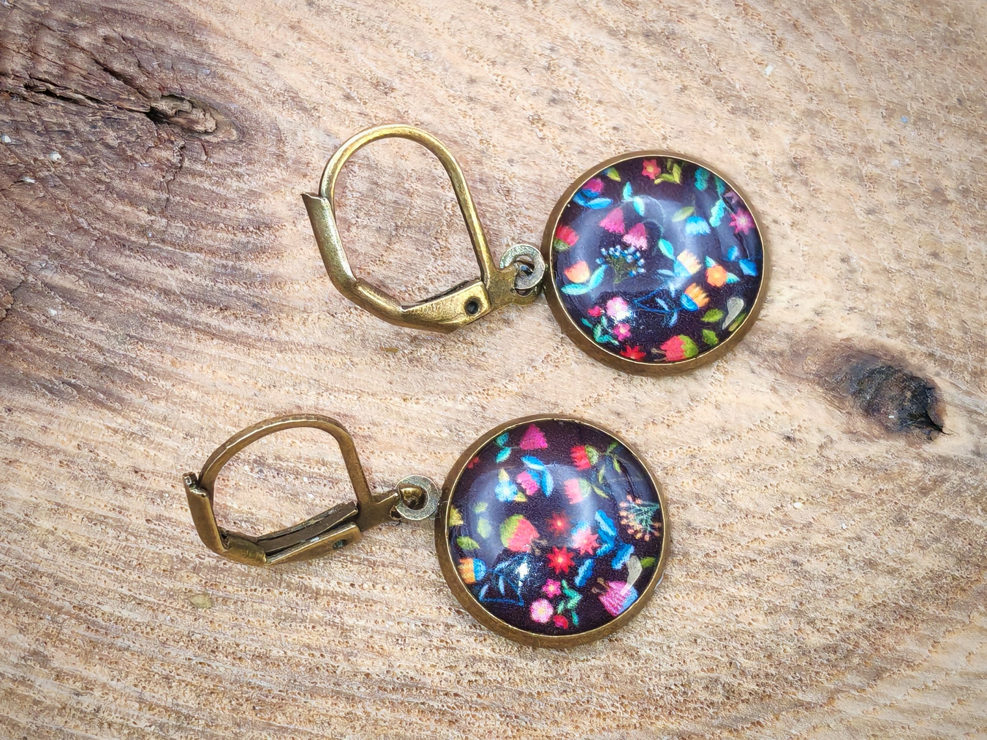 On croirait voir une nappe brodée de fleurs glissée dans la lumière d’une veillée d’été. Sur un fond noir profond, les motifs floraux aux teintes éclatantes — bleu royal, rouge coquelicot, rose tendre, vert prairie et jaune or — semblent jaillir d’un tissu folklorique revisité. Chaque cabochon en résine de 12 mm offre un motif dense, coloré et plein de caractère.