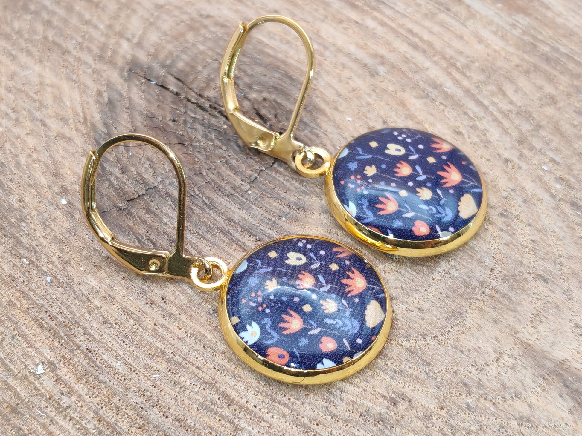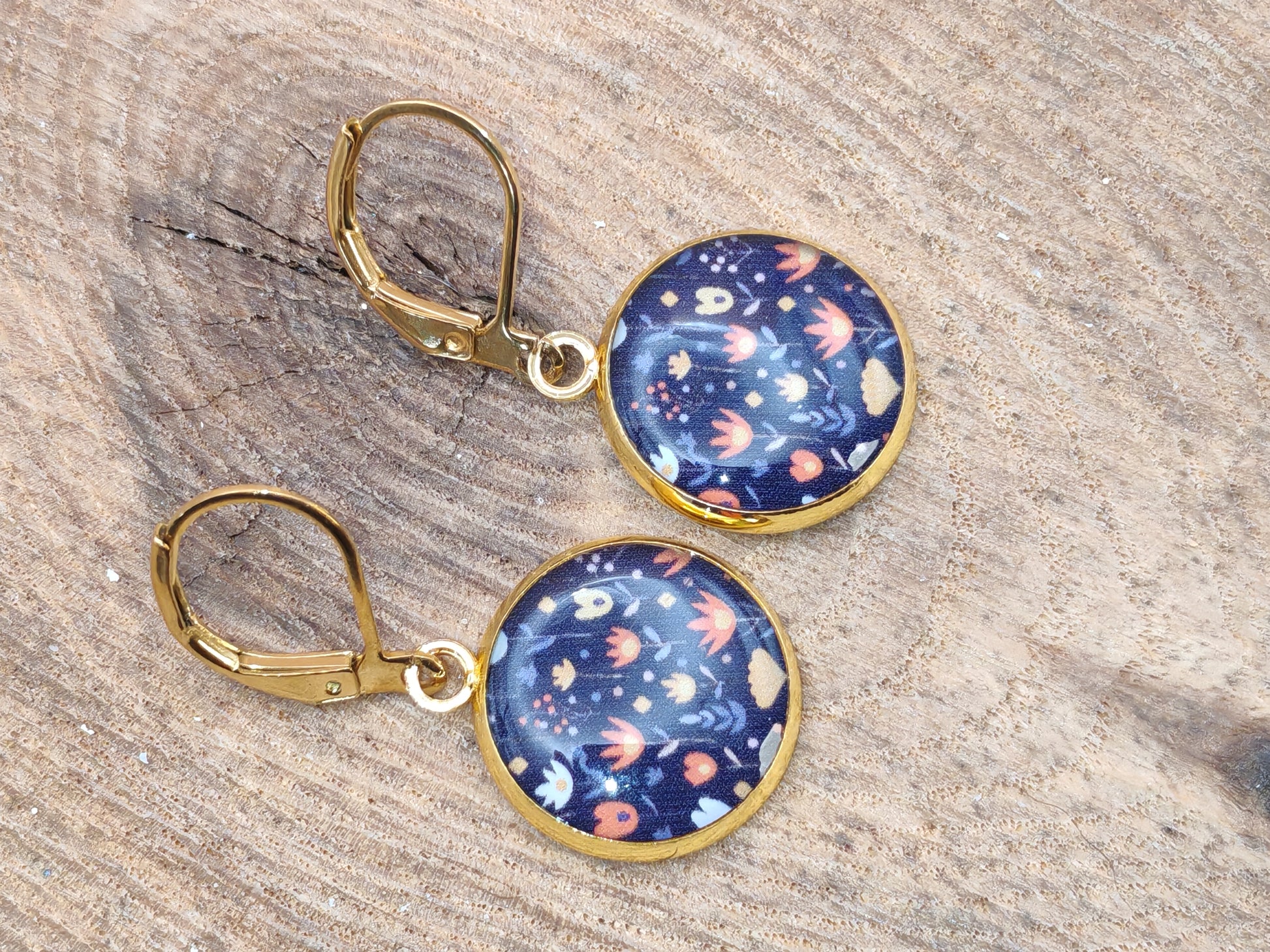 Ces boucles d’oreilles dormeuses se composent d’un cabochon rond de 14 mm, orné d’un motif floral délicat aux teintes chaudes et lumineuses, parsemé sur un fond bleu profond presque nocturne. Les petites fleurs stylisées et touches végétales créent un contraste doux et élégant, évoquant un jardin discret éclairé à la tombée du jour.