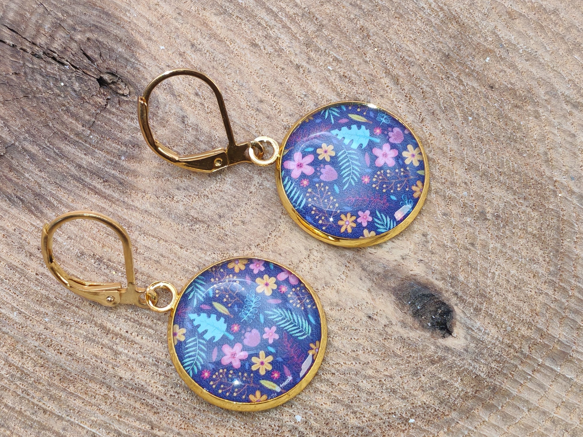 Ces boucles d’oreilles dormeuses sont composées d’un cabochon rond de 16 mm, orné d’un motif végétal délicat mêlant feuillages fins et petites fleurs stylisées. Les teintes douces de rose, jaune et vert se détachent sur un fond bleu profond, créant une ambiance poétique et légèrement nocturne, à la fois élégante et apaisante.