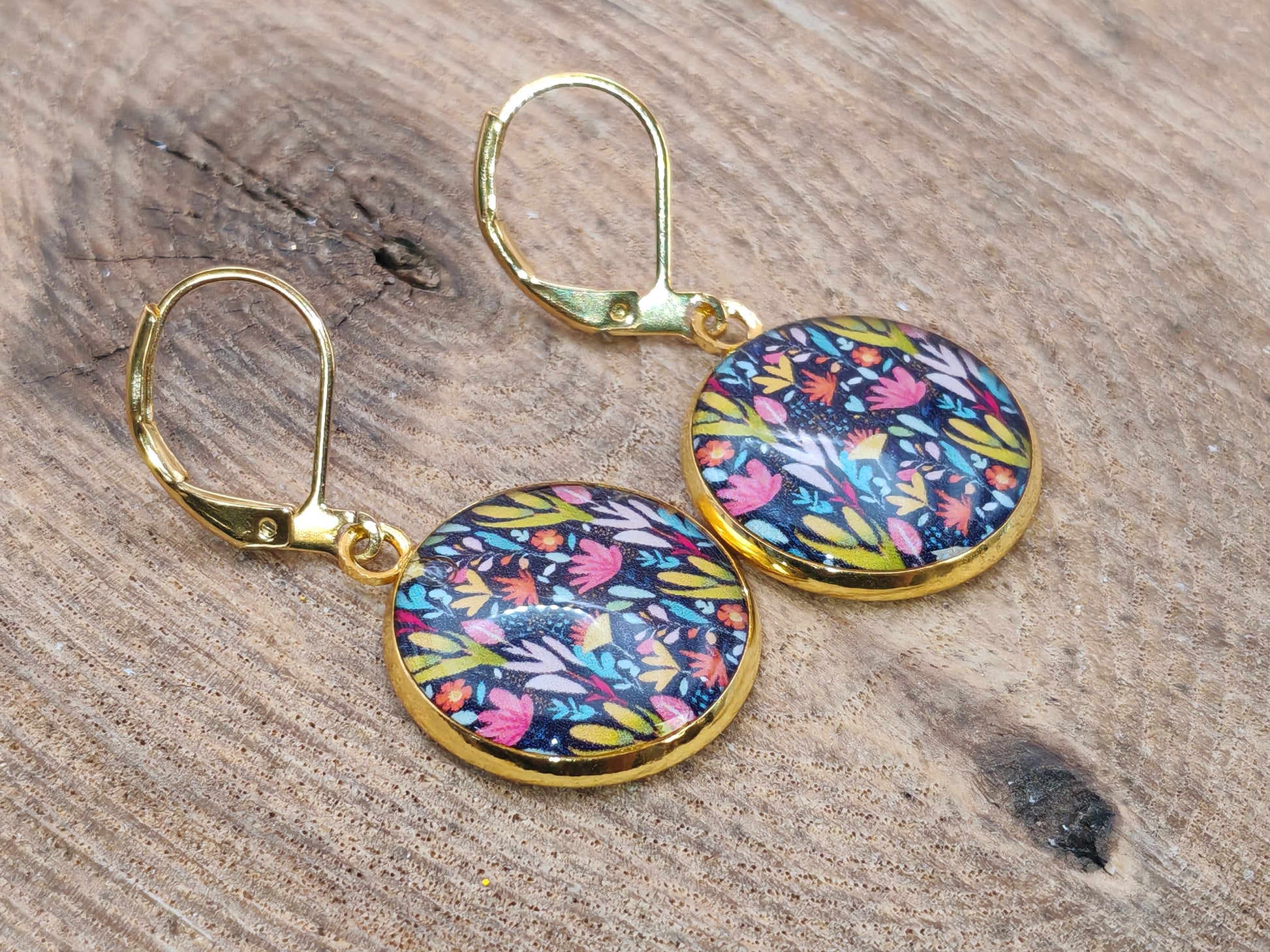 Ces boucles d’oreilles dormeuses se composent d’un cabochon rond de 16 mm, habillé d’un motif végétal foisonnant mêlant feuillages élancés et petites fleurs aux teintes chaudes de rose, jaune et vert. Le fond sombre met en valeur les couleurs et apporte de la profondeur à l’ensemble, pour un rendu à la fois vibrant et élégant.