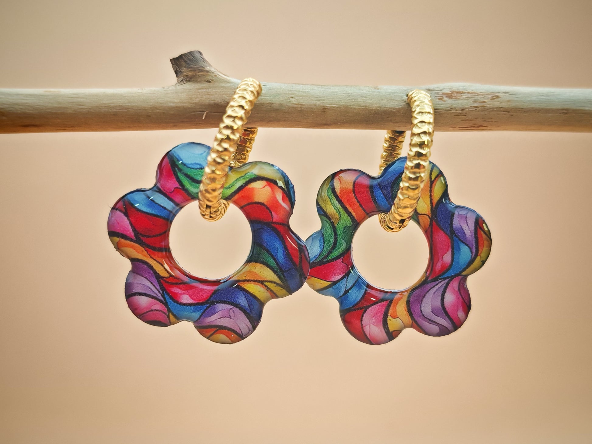 Ces boucles d’oreilles en forme de fleur de 2,5 cm de diamètre dévoilent un motif fluide et coloré, composé de vagues entremêlées dans des tons rose, fuchsia, turquoise, bleu profond, jaune lumineux et touches violacées. Un véritable tourbillon de couleurs qui attire la lumière et capte le regard.