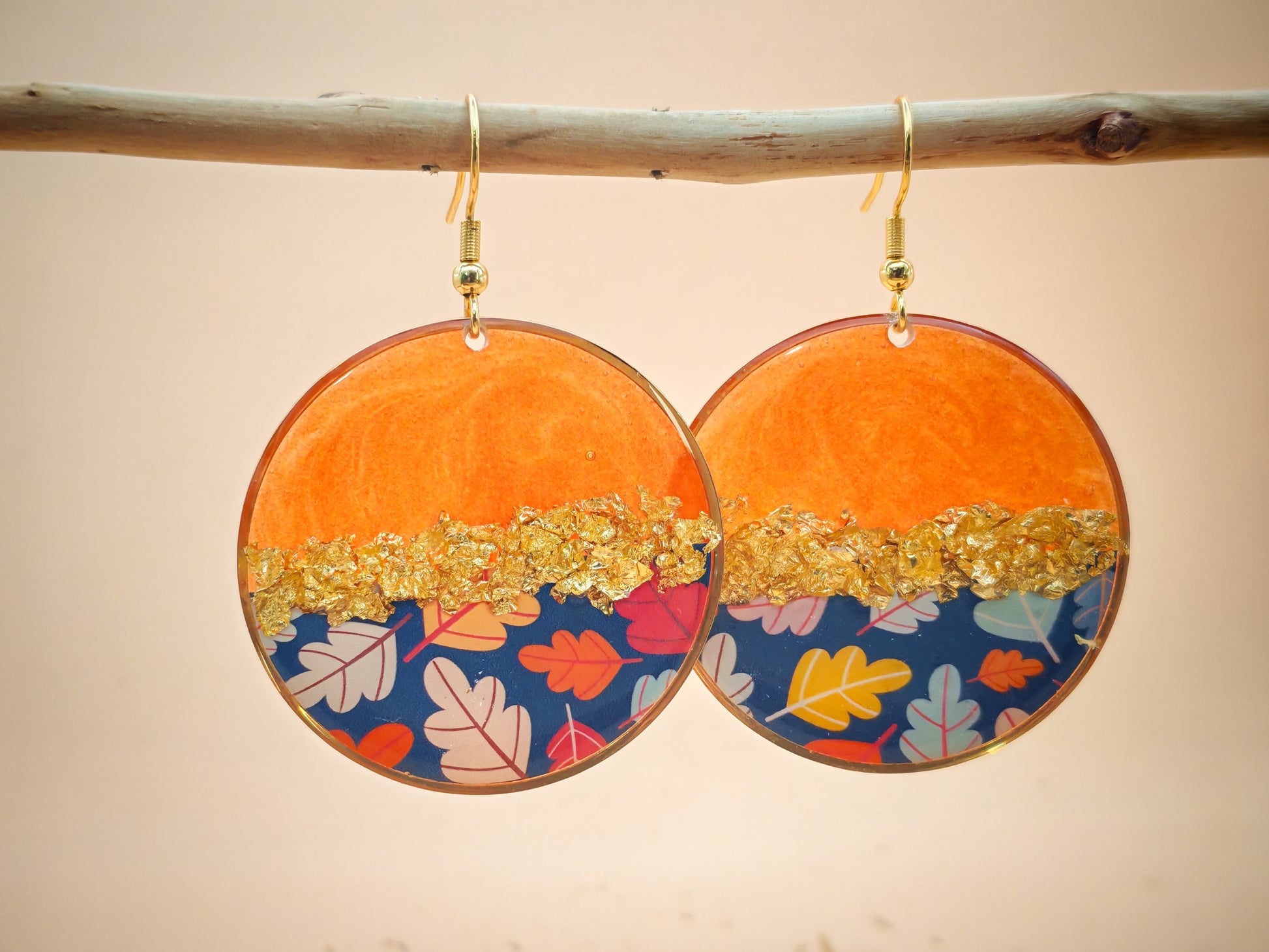 Ces boucles d’oreilles pendantes sont réalisées à partir d’un cercle doré d’environ 4 cm de diamètre, dans lequel la résine est coulée à la main. Le cercle se compose de deux parties harmonieuses : une moitié en résine rouge cuivré aux reflets nacrés et marbrés, évoquant une matière chaude et lumineuse, et une moitié recouverte d’un motif décoratif délicat composé de feuillages stylisés, de formes végétales et de détails graphiques aux teintes douces et contrastées sur fond bleu profond.