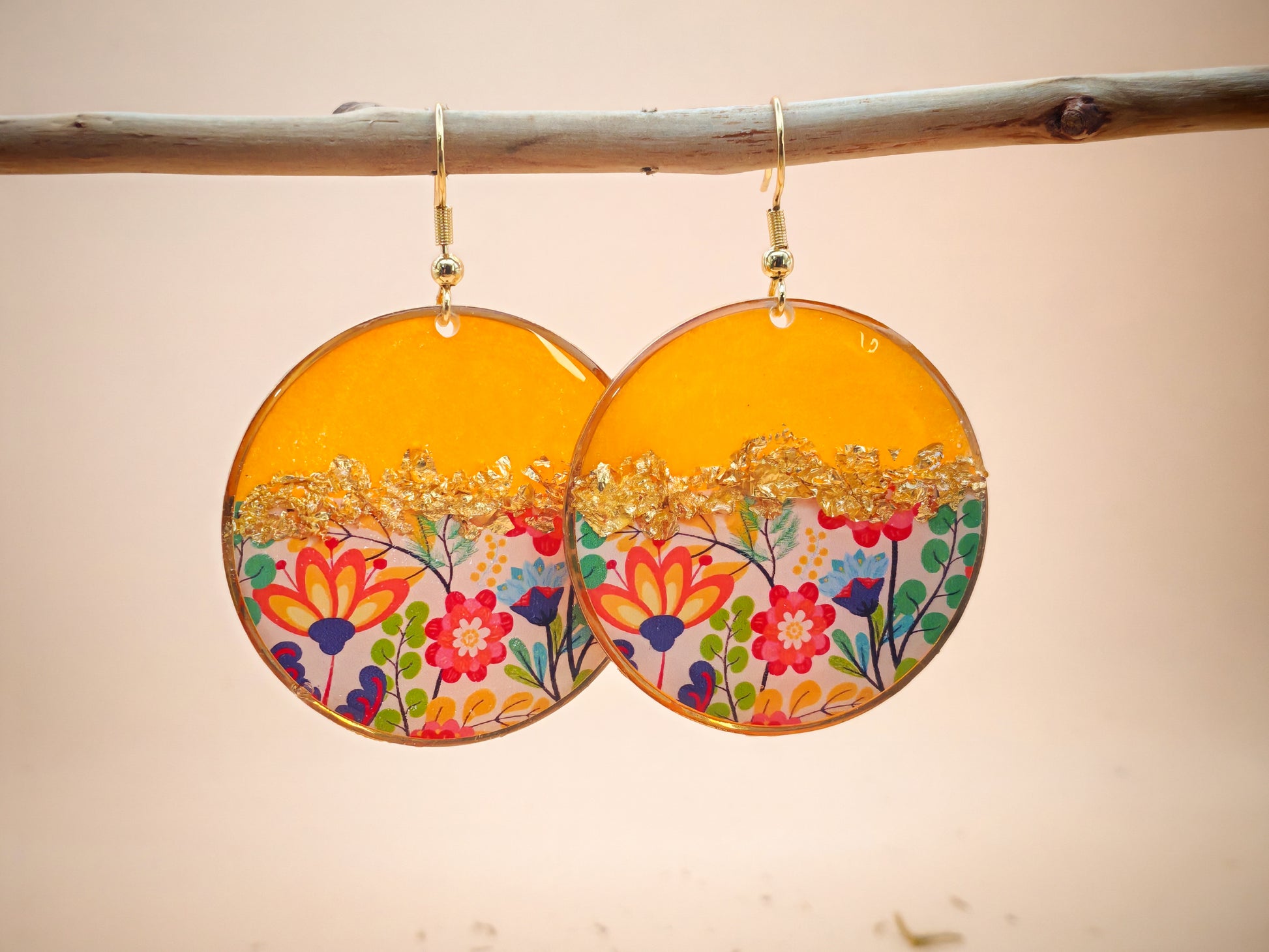 Ces boucles d’oreilles pendantes sont réalisées à partir d’un cercle doré d’environ 4 cm de diamètre, dans lequel la résine est coulée à la main. Le cercle se compose de deux parties harmonieuses : une moitié en résine dorée aux reflets lumineux et légèrement nacrés, évoquant une matière solaire et chaleureuse, et une moitié recouverte d’un motif décoratif floral composé de fleurs stylisées et de feuillages colorés, aux teintes vives et joyeuses sur fond clair.