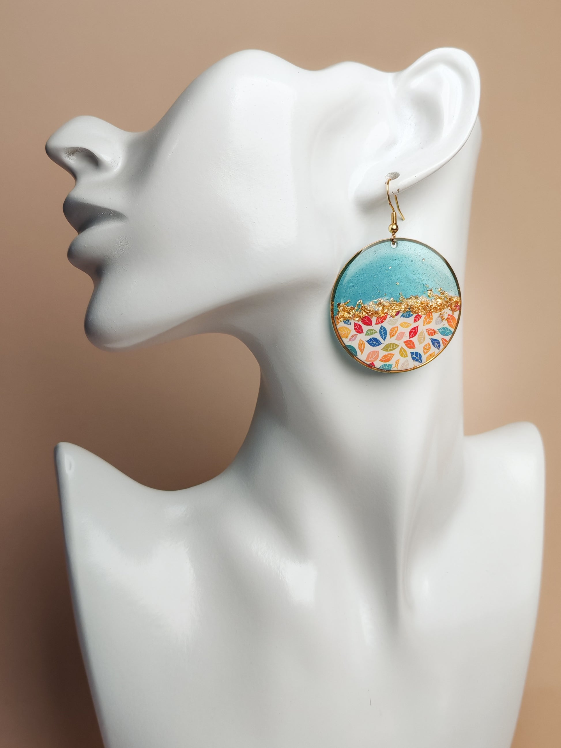 Ces boucles d’oreilles pendantes sont réalisées à partir d’un cercle doré de 4 cm de diamètre, dans lequel la résine est coulée à la main. Le cercle est divisé en deux parties : l’une dévoile une résine bleu profond aux reflets légèrement nacrés, avec un effet marbré lumineux, tandis que l’autre est recouverte d’un motif de feuillages délicats et multicolores sur fond clair, apportant fraîcheur et douceur à l’ensemble.
