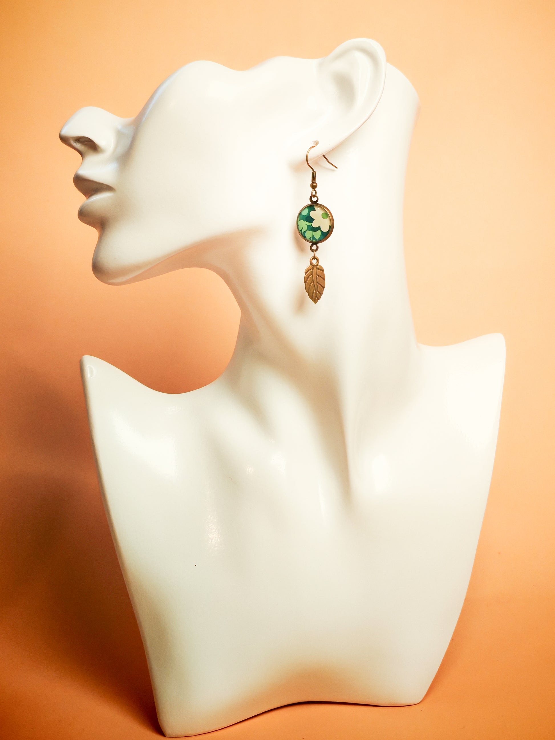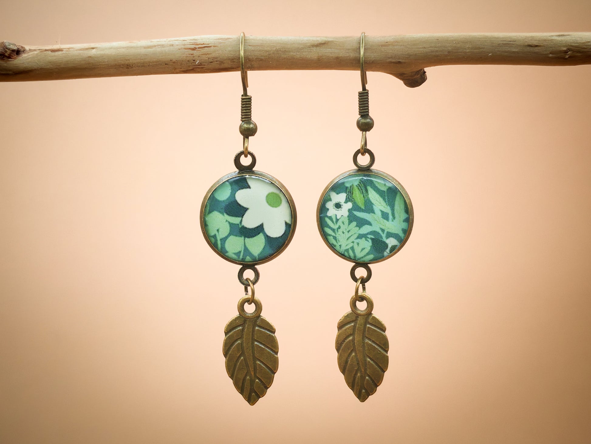 Les boucles d’oreilles sont composées de cabochons en résine de 14 mm, surmontant une feuille en métal bronze antique qui prolonge le motif avec élégance et mouvement. Le pendentif reprend le même visuel floral, avec un cabochon en résine de 16 mm, monté sur un cordon clair au rendu souple et naturel, pour une harmonie parfaite entre les pièces.