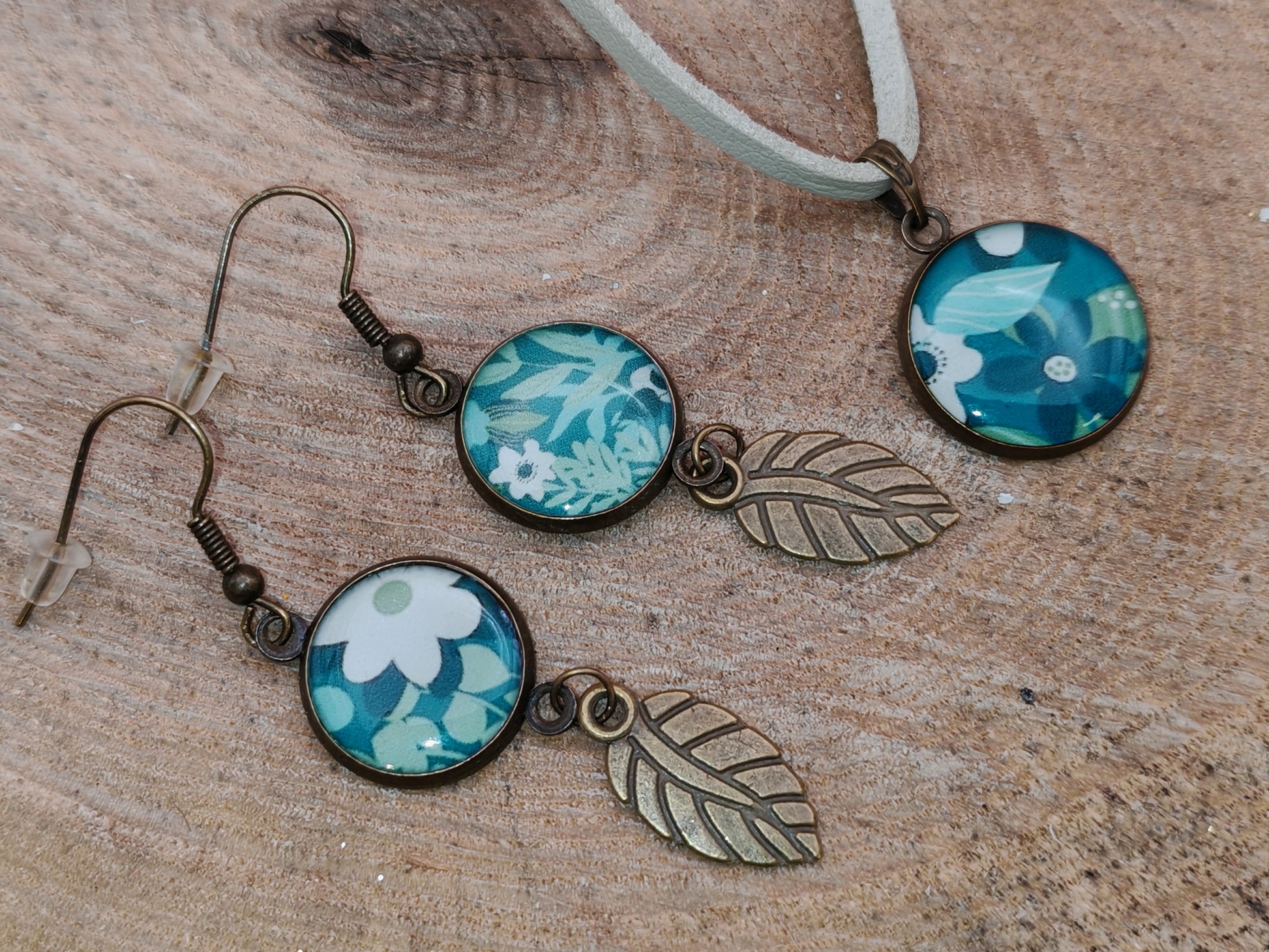 Ces boucles d’oreilles et leur pendentif assorti dévoilent un univers floral au charme délicatement rétro. De grandes fleurs blanches se détachent sur un fond bleu-vert profond, ponctué de feuillages stylisés aux nuances douces, presque aquatiques.
